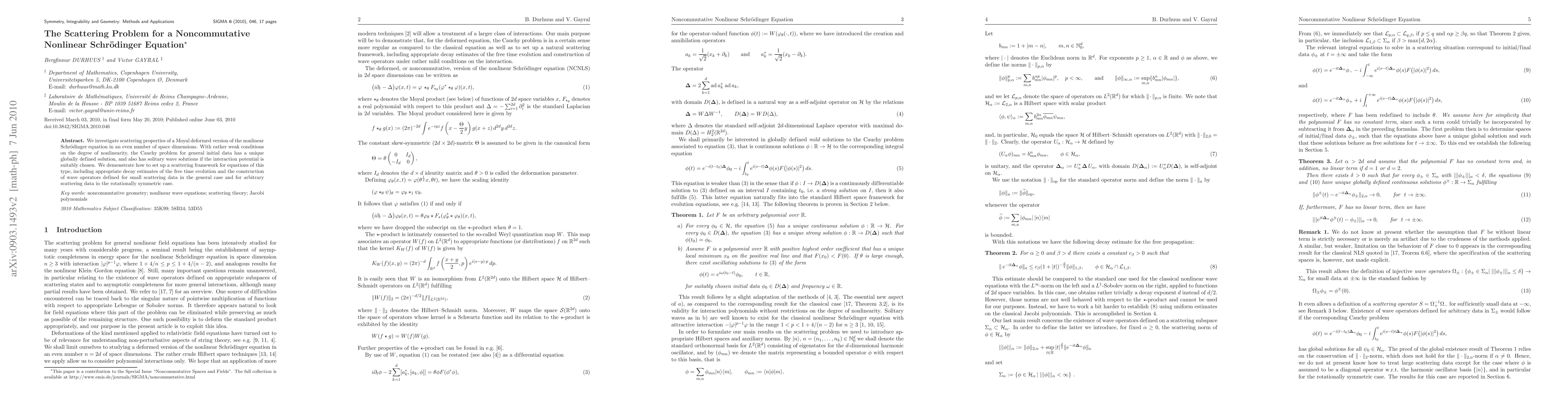 We investigate scattering properties of a Moyal deformed version of the nonlinear Schr\"odinger equation in an even number of space dimensions. With rather weak conditions on the degree of nonlinearity, the Cauchy problem for general initial data has a unique globally defined solution, and also has soliton solutions if the interaction potential is suitably chosen. We demonstrate how to set up a scattering framework for equations of this type, including appropriate decay estimates of the free time evolution and the construction of wave operators defined for small scattering data in the general case and for arbitrary scattering data in the rotationally symmetric case.