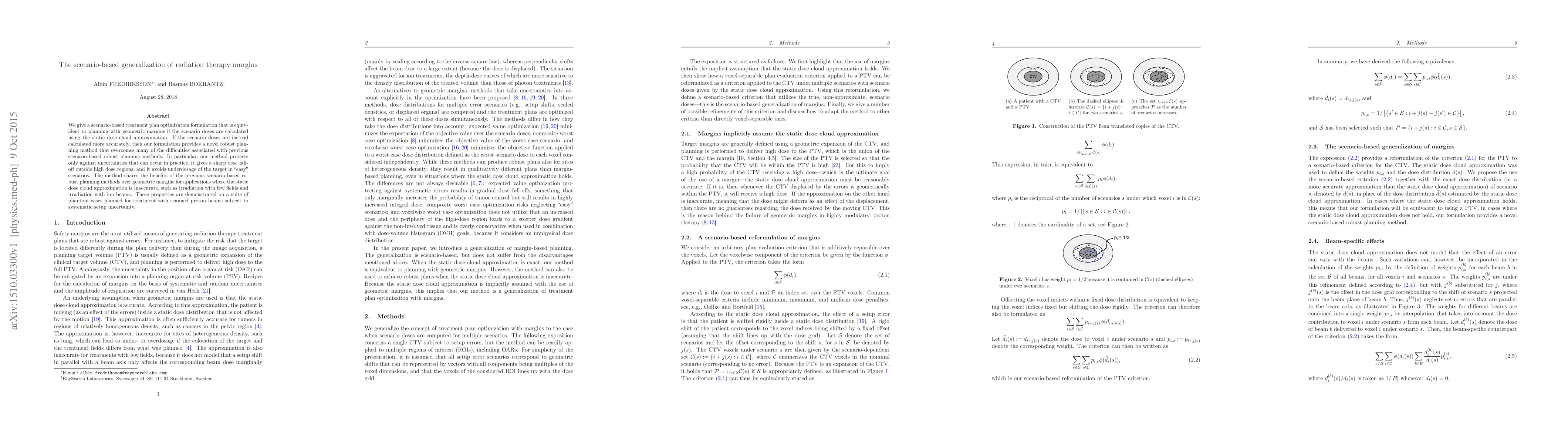 This research introduces a scenario-based treatment plan optimization for radiation therapy, equivalent to traditional margin methods under certain conditions. More accurate scenario dose calculations enable a novel robust planning method, addressing practical uncertainty issues, ensuring sharp dose fall-off, and preventing target underdosage in manageable scenarios. This method outperforms traditional methods in specific cases, like proton beam irradiation with setup uncertainties, demonstrated through phantom experiments.