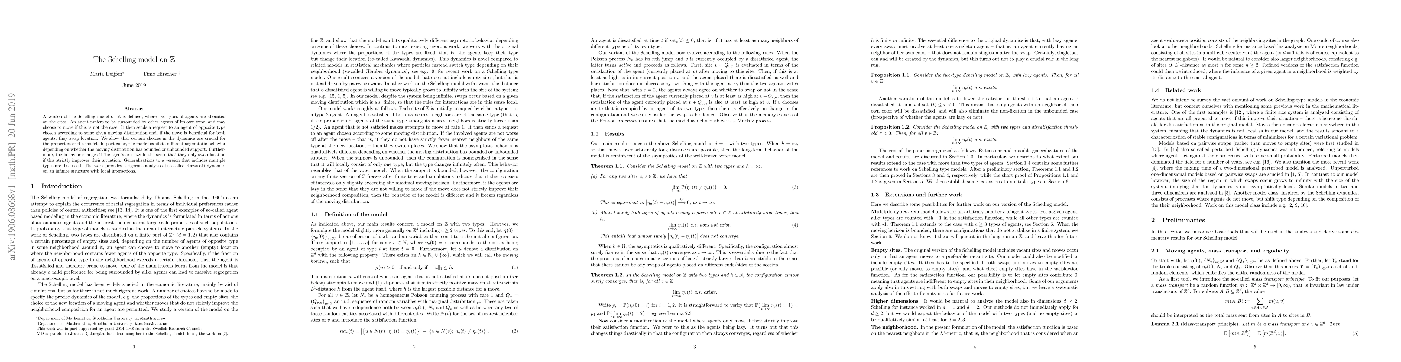 This research introduces a Schelling model on the integer number line, analyzing how two types of agents interact and move based on their preference for similar neighbors. Key findings reveal distinct long-term behaviors depending on the moving distribution's support and whether agents are lazy. The study also discusses generalizations for multiple agent types, contributing to the understanding of Kawasaki dynamics on infinite structures with local interactions.