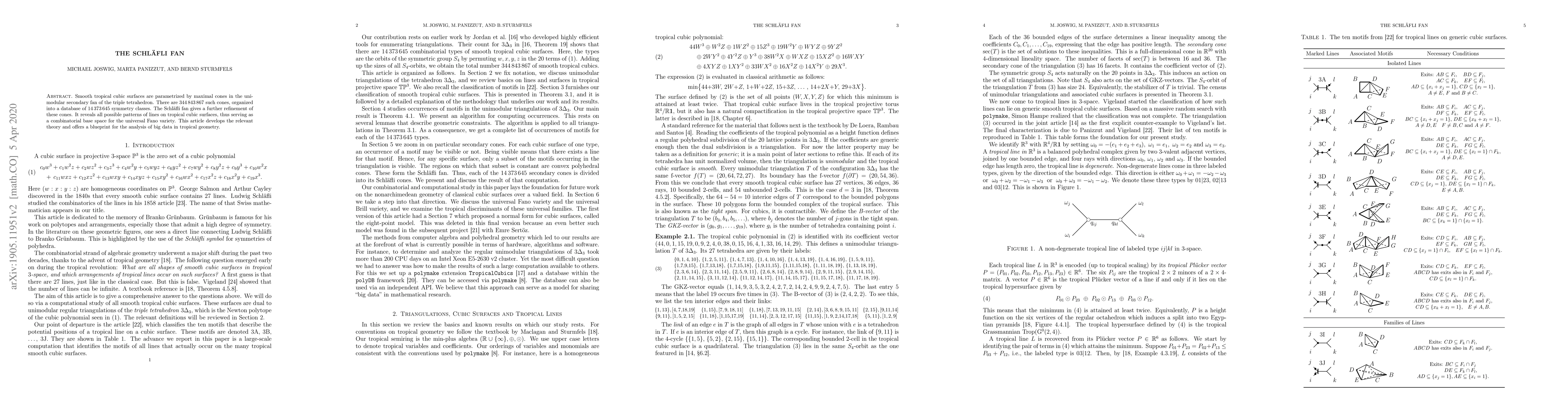This paper explores the Schl\"afli fan, which refines the classification of smooth tropical cubic surfaces by organizing $344\,843\,867$ maximal cones into $14\,373\,645$ symmetry classes, revealing all possible line patterns on these surfaces and serving as a combinatorial base for the universal Fano variety. The developed theory provides a framework for analyzing big data in tropical geometry.