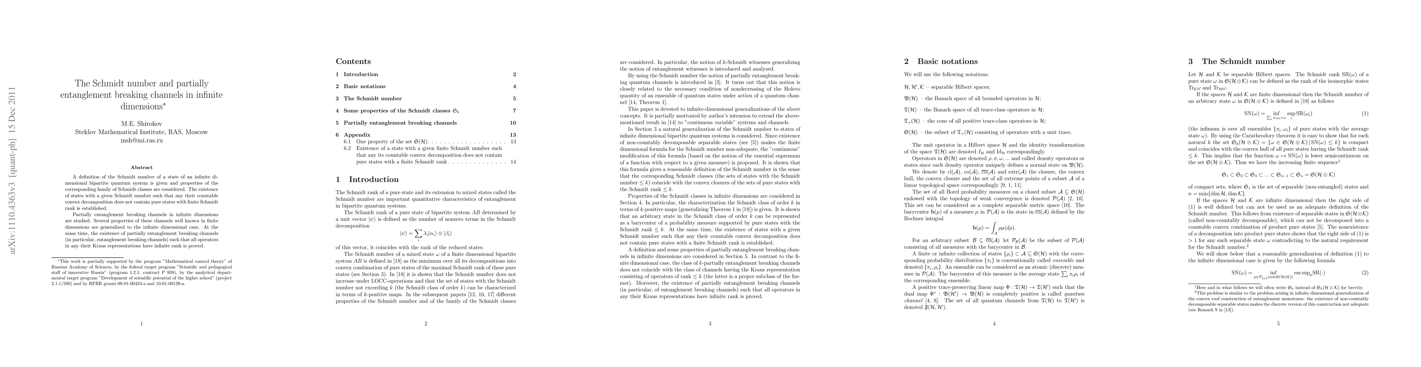 This paper defines the Schmidt number for infinite-dimensional bipartite quantum systems and explores the properties of corresponding Schmidt classes. It also investigates partially entanglement breaking channels in infinite dimensions, generalizing known properties from finite dimensions and proving the existence of channels where all Kraus operators have infinite rank.