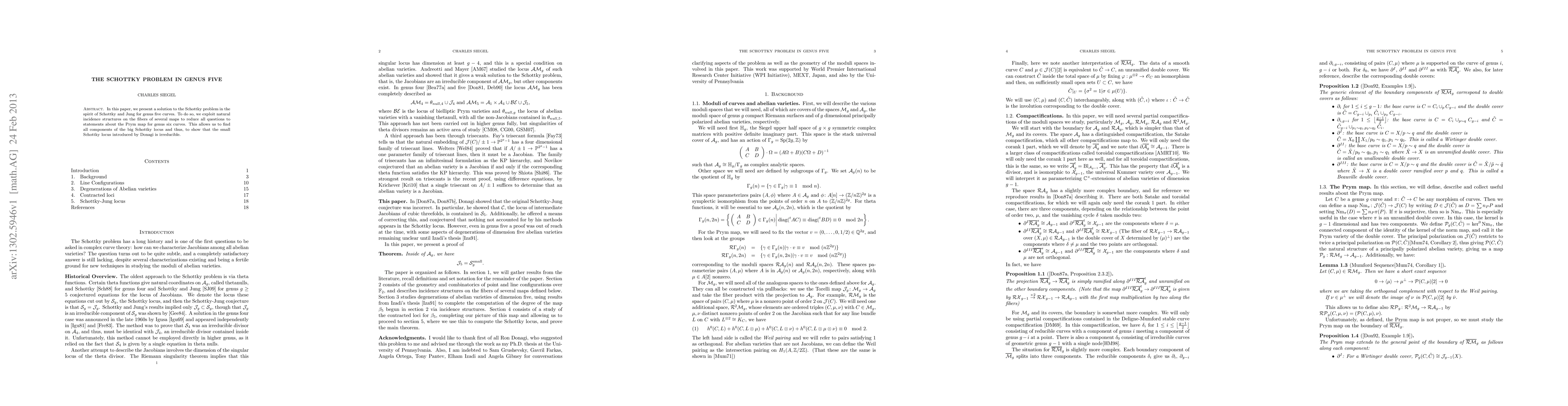 This paper solves the Schottky problem for genus five curves by leveraging incidence structures and reducing questions to the Prym map for genus six curves, ultimately proving the irreducibility of Donagi's small Schottky locus.