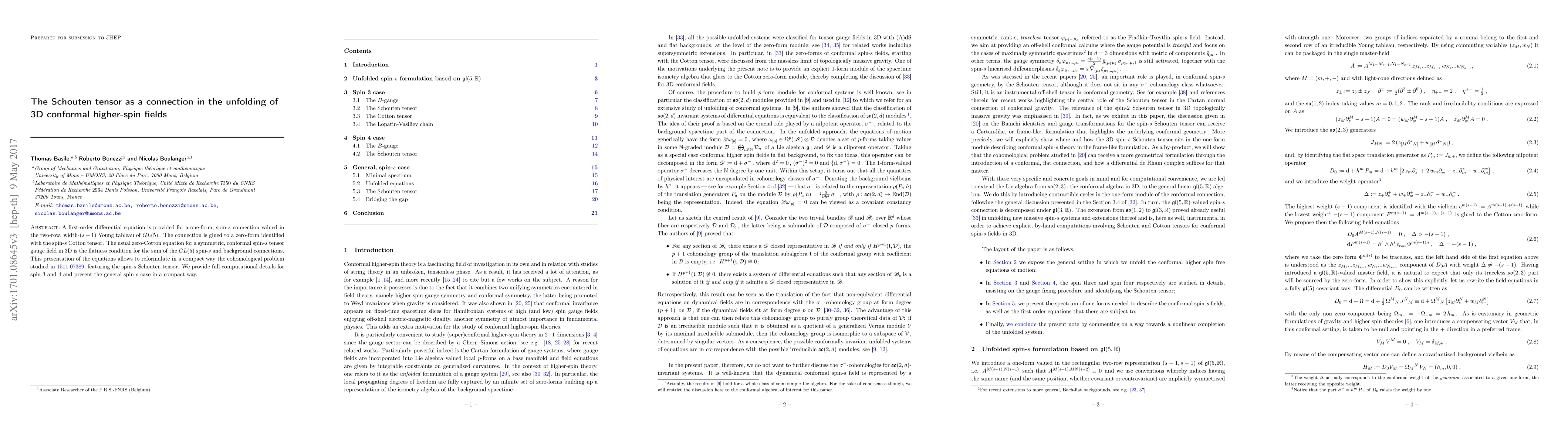 A first-order differential equation is provided for a one-form, spin-s connection valued in the two-row, width-(s-1) Young tableau of GL(5). The connection is glued to a zero-form identified with the spin-s Cotton tensor. The usual zero-Cotton equation for a symmetric, conformal spin-s tensor gauge field in 3D is the flatness condition for the sum of the GL(5) spin-s and background connections. This presentation of the equations allows to reformulate in a compact way the cohomological problem studied in 1511.07389, featuring the spin-s Schouten tensor. We provide full computational details for spin 3 and 4 and present the general spin-s case in a compact way.