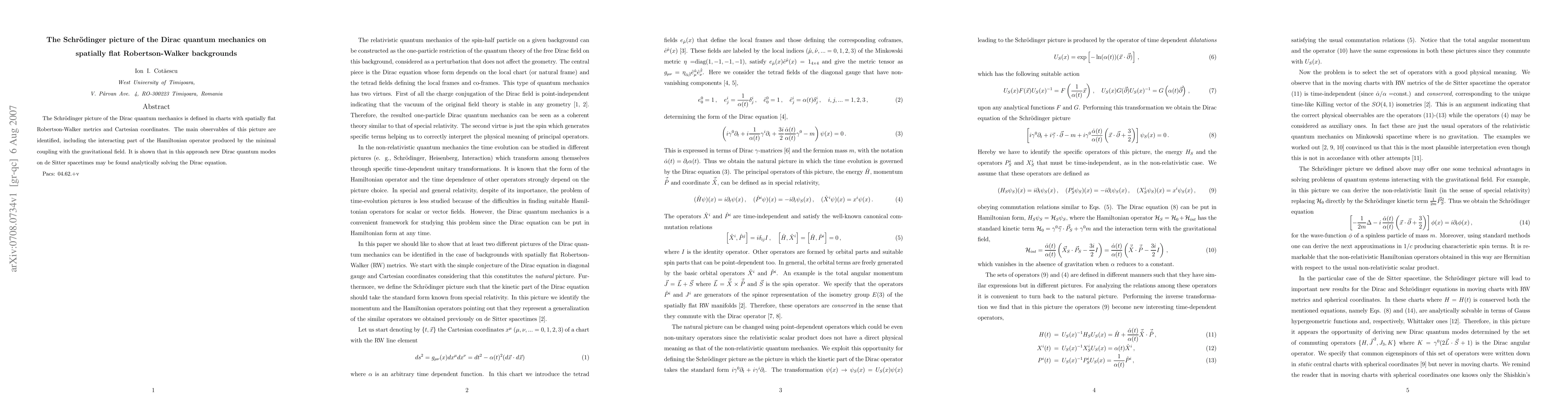 The Schr\" odinger picture of the Dirac quantum mechanics is defined in charts with spatially flat Robertson-Walker metrics and Cartesian coordinates. The main observables of this picture are identified, including the interacting part of the Hamiltonian operator produced by the minimal coupling with the gravitational field. It is shown that in this approach new Dirac quantum modes on de Sitter spacetimes may be found analytically solving the Dirac equation.