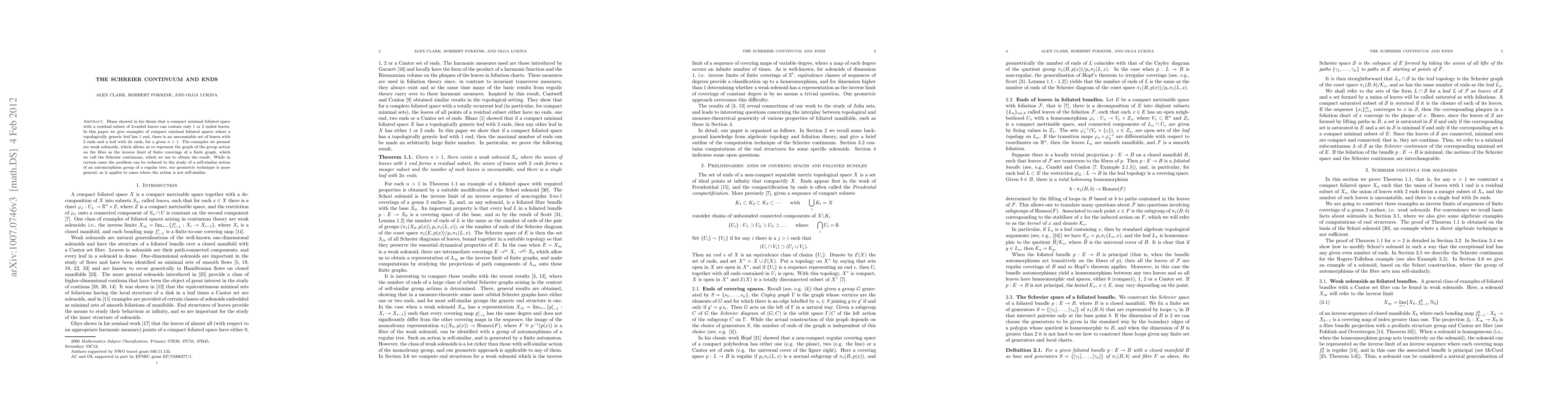 This paper provides examples of compact minimal foliated spaces with a topologically generic leaf having 1 end, alongside an uncountable set of leaves with 2 ends and a leaf with 2n ends for n > 1. The authors use weak solenoids and the Schreier continuum to achieve these results, demonstrating a more general geometric technique applicable beyond self-similar actions.