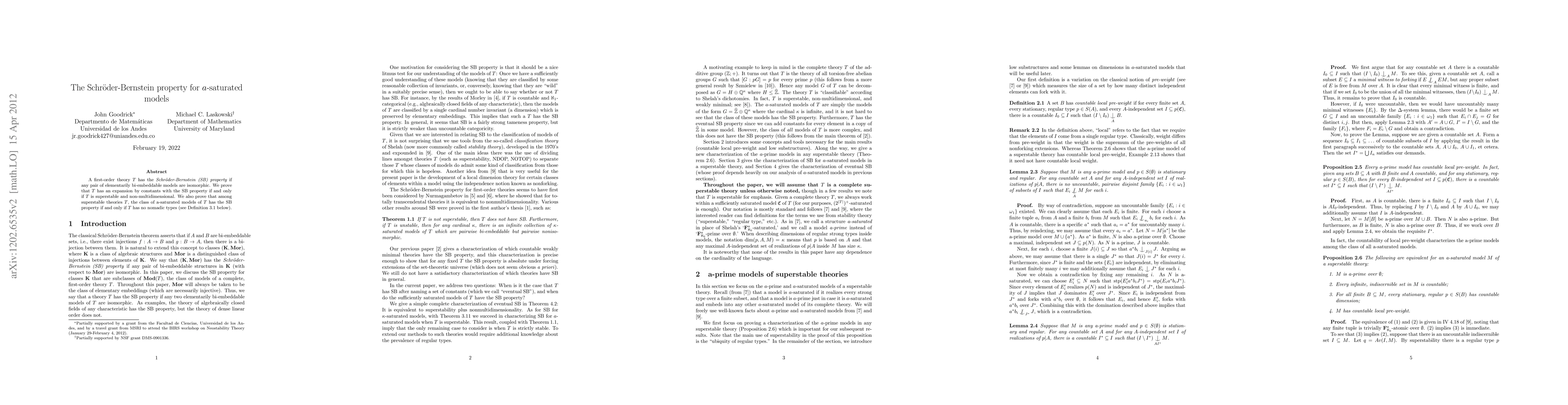 Summary: The paper proves that a first-order theory T has the Schröder-Bernstein property if and only if it is superstable and non-multidimensional, and among superstable theories, a-saturated models possess this property if and only if T lacks nomadic types.