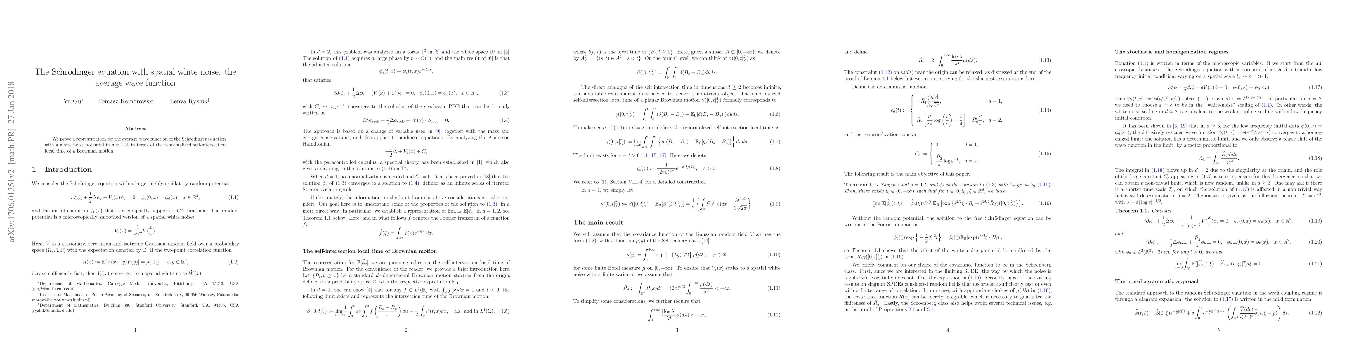 Summary: This paper establishes a representation for the average wave function in the Schrödinger equation with a white noise potential, linking it to the renormalized self-intersection local time of a Brownian motion in dimensions $d=1,2$. The result provides insight into the behavior of quantum systems influenced by stochastic potentials.