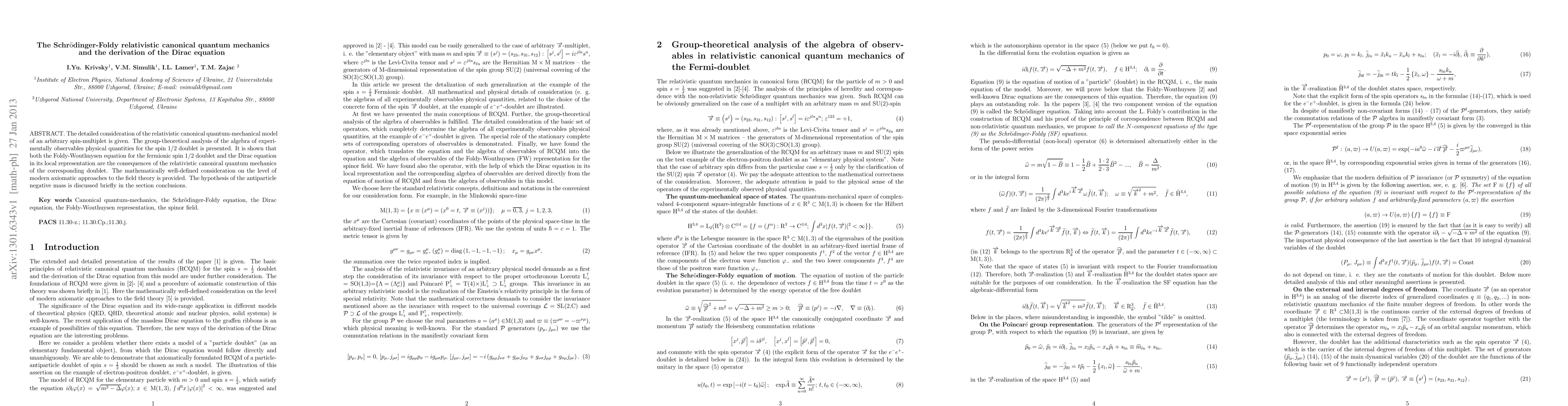 The detailed consideration of the relativistic canonical quantum-mechanical model of an arbitrary spin-multiplet is given. The group-theoretical analysis of the algebra of experimentally observables physical quantities for the spin 1/2 doublet is presented. It is shown that both the Foldy-Wouthuysen equation for the fermionic spin 1/2 doublet and the Dirac equation in its local representation are the consequences of the relativistic canonical quantum mechanics of the corresponding doublet. The mathematically well-defined consideration on the level of modern axiomatic approaches to the field theory is provided. The hypothesis of the antiparticle negative mass is discussed briefly in the section conclusions.