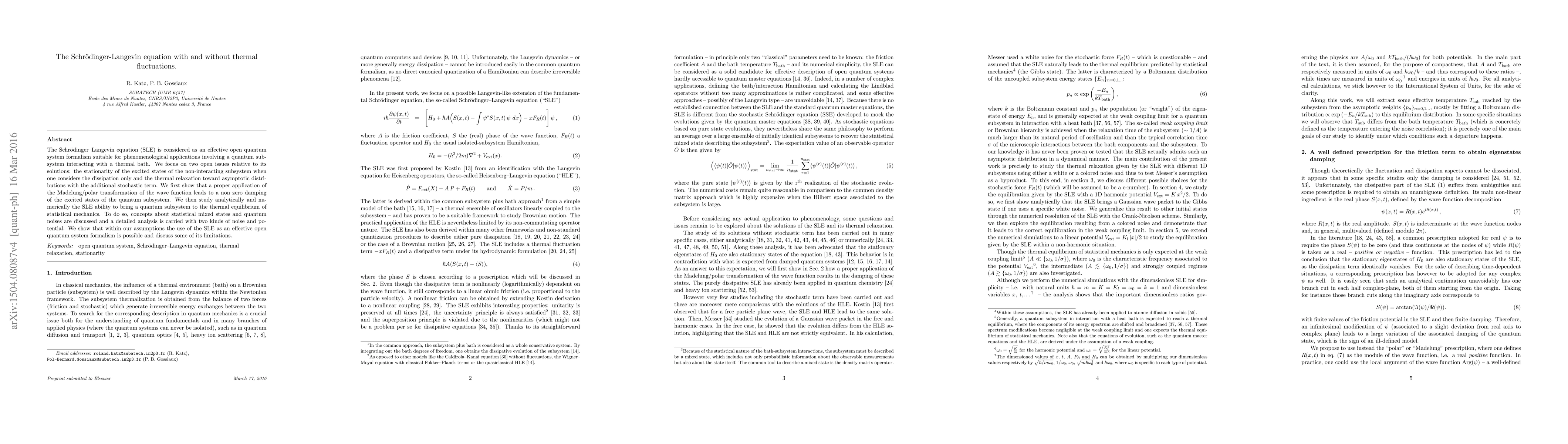 The Schr\"odinger-Langevin (SL) equation is considered as an effective open quantum system formalism suitable for phenomenological applications involving a quantum subsystem interacting with a thermal bath. We focus on two open issues relative to its solutions: the stationarity of the excited states of the non-interacting subsystem when one considers the dissipation only and the thermal relaxation toward asymptotic distributions with the additional stochastic term. We first show that a proper application of the Madelung/polar transformation of the wave function leads to a non zero damping of the excited states of the quantum subsystem. We then study analytically and numerically the SL equation ability to bring a quantum subsystem to the thermal equilibrium of statistical mechanics. To do so, concepts about statistical mixed states and quantum noises are discussed and a detailed analysis is carried with two kinds of noise and potential. We show that within our assumptions the use of the SL equation as an effective open quantum system formalism is possible and discuss some of its limitations.