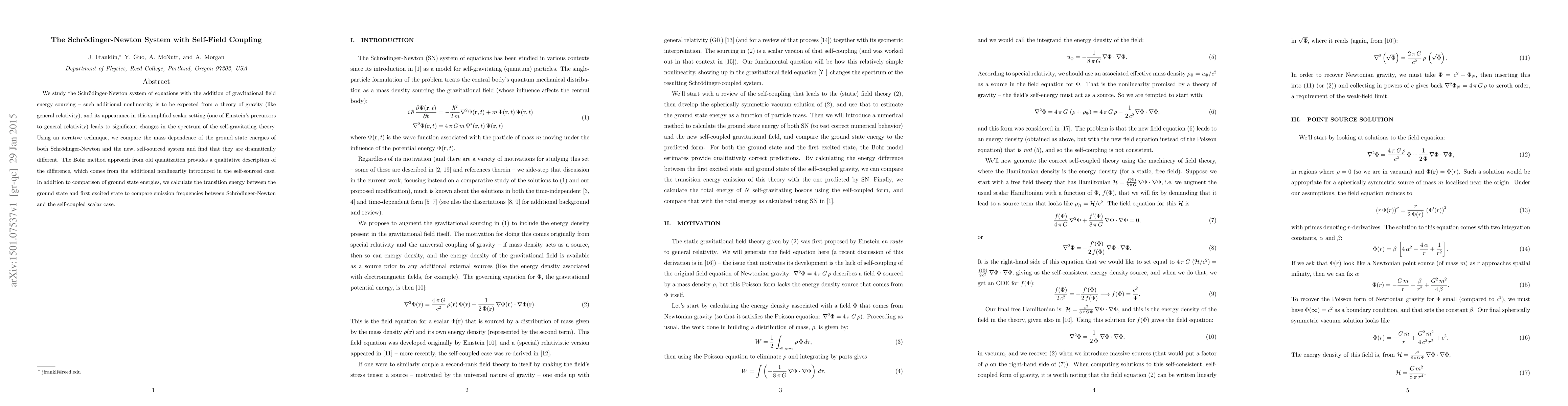 This research investigates the Schrodinger-Newton system with self-field coupling, revealing significant differences in ground state energies due to added gravitational field energy sourcing. Utilizing iterative techniques and Bohr method approach, the study finds distinct mass dependence and emission frequencies between Schrodinger-Newton and the self-coupled scalar case.
