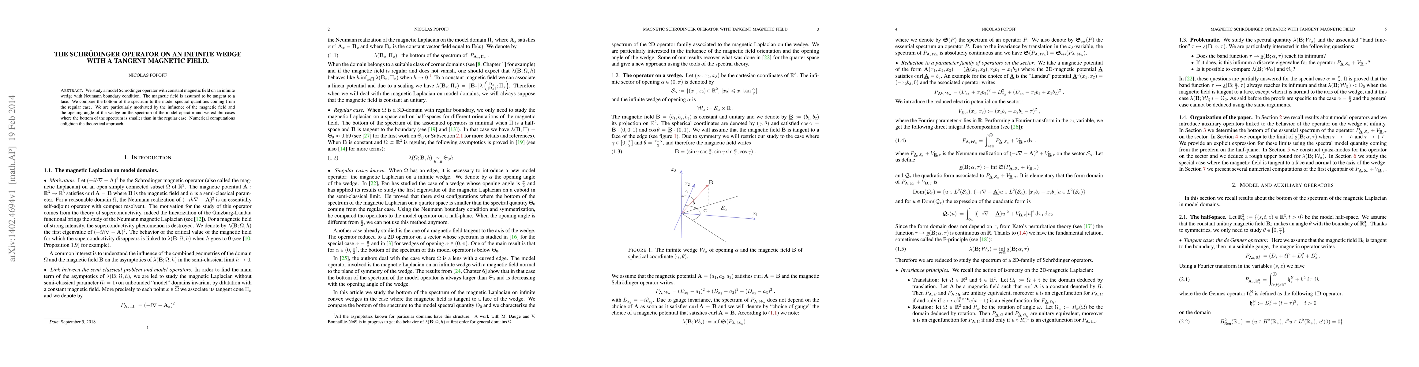We study a model Schr\"odinger operator with constant magnetic field on an infinite wedge with Neumann boundary condition. The magnetic field is assumed to be tangent to a face. We compare the bottom of the spectrum to the model spectral quantities coming from the regular case. We are particularly motivated by the influence of the magnetic field and the opening angle of the wedge on the spectrum of the model operator and we exhibit cases where the bottom of the spectrum is smaller than in the regular case. Numerical computations enlighten the theoretical approach.