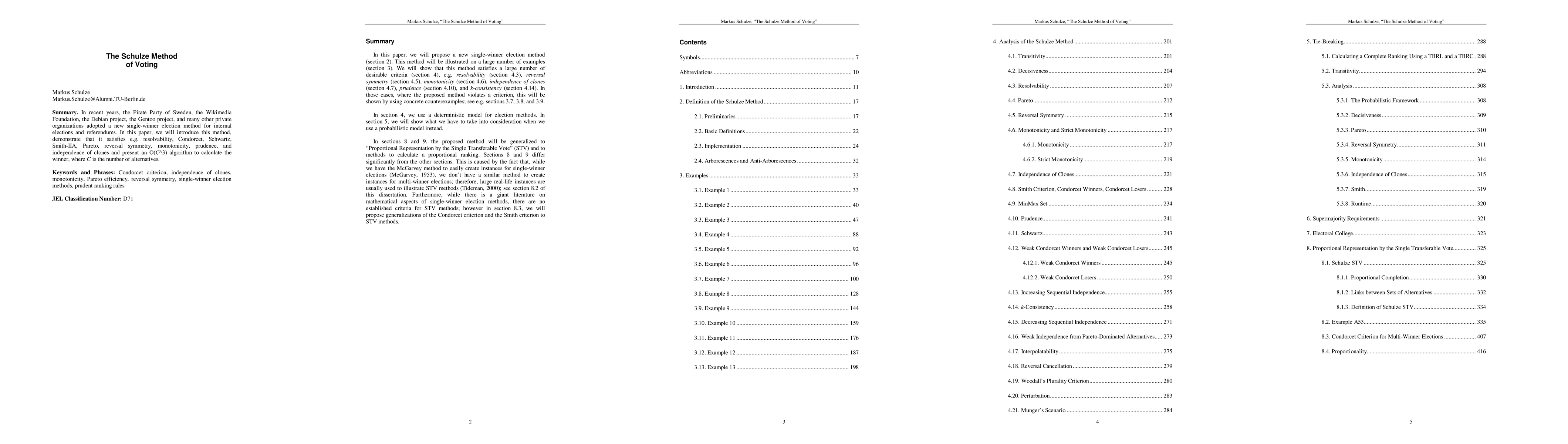 The Schulze Method is a new single-winner voting system that meets several desirable criteria like monotonicity and polynomial runtime. The method is also extended for proportional representation and multi-winner elections, with comprehensive examples provided for illustration.