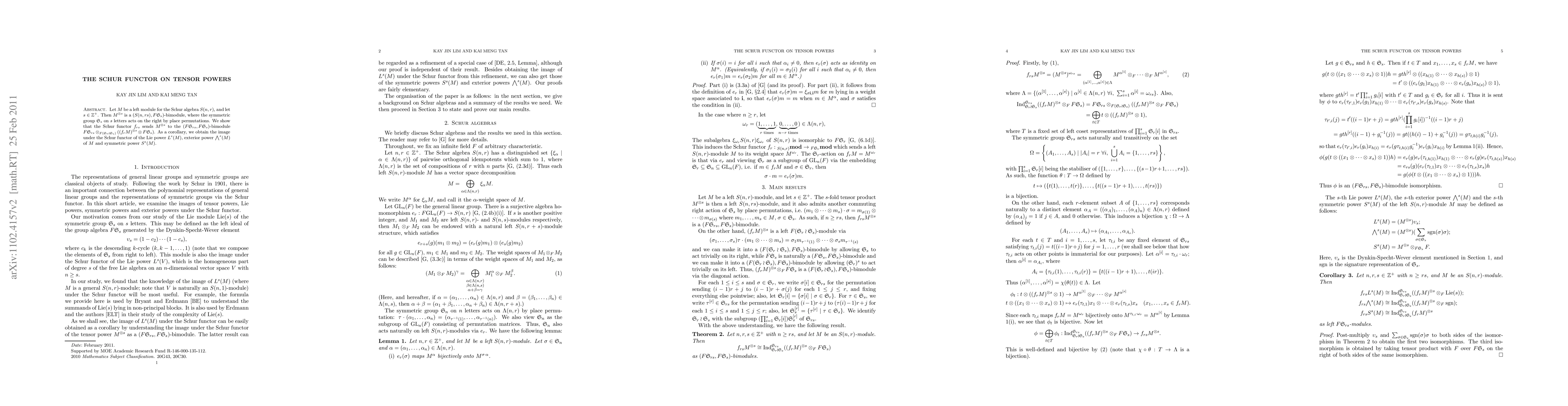 Let $M$ be a left module for the Schur algebra $S(n,r)$, and let $s \in \mathbb{Z}^+$. Then $M^{\otimes s}$ is a $(S(n,rs), F\mathfrak{S}_s)$-bimodule, where the symmetric group $\mathfrak{S}_s$ on $s$ letters acts on the right by place permutations. We show that the Schur functor $f_{rs}$ sends $M^{\otimes s}$ to the $(F\mathfrak{S}_{rs},F\mathfrak{S}_s)$-bimodule $F\mathfrak{S}_{rs} \otimes_{F(\mathfrak{S}_r \wr \mathfrak{S}_s)} ((f_rM)^{\otimes s} \otimes F\mathfrak{S}_s)$. As a corollary, we obtain the effect of the Schur functor on the Lie power $L^s(M)$, symmetric power $S^s(M)$ and exterior power $\bigwedge^s(M)$ of $M$.
