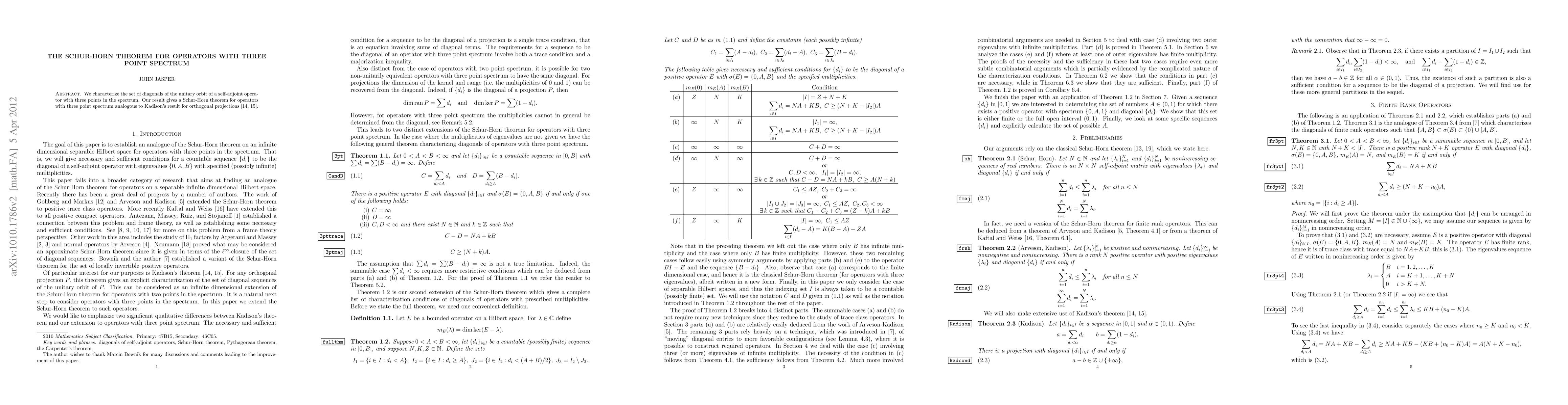 Summary: The paper characterizes the set of diagonals of unitary orbits of self-adjoint operators with three points in the spectrum, providing a Schur-Horn theorem analogous to Kadison's result for orthogonal projections. This extends the classical theorem to operators with a limited point spectrum.