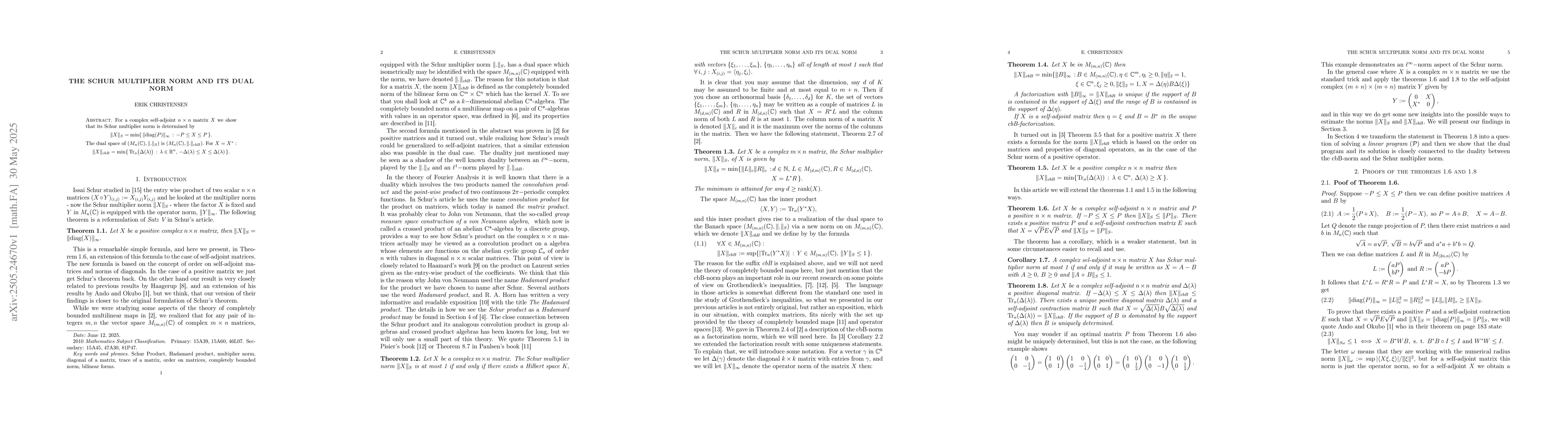The paper presents a mathematical analysis involving the Schur multiplier norm and its dual norm for complex self-adjoint matrices, utilizing minimization formulas and operator norms.