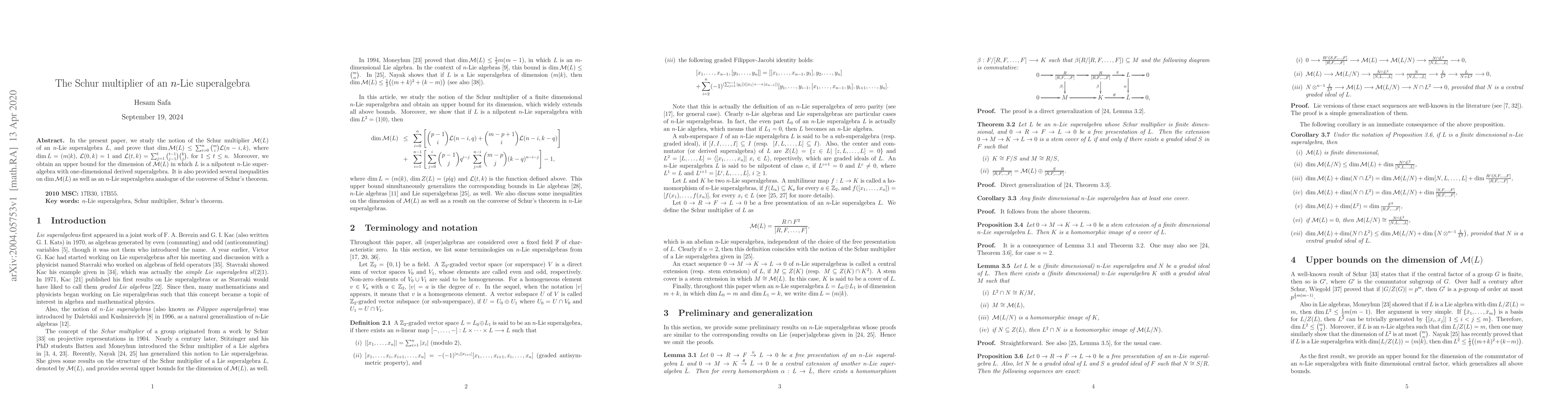 The paper investigates the Schur multiplier $\mathcal{M}(L)$ of an $n$-Lie superalgebra $L$, establishing an upper bound for its dimension based on the structure of $L$. It also provides several inequalities and an analogue of Schur's theorem for $n$-Lie superalgebras.