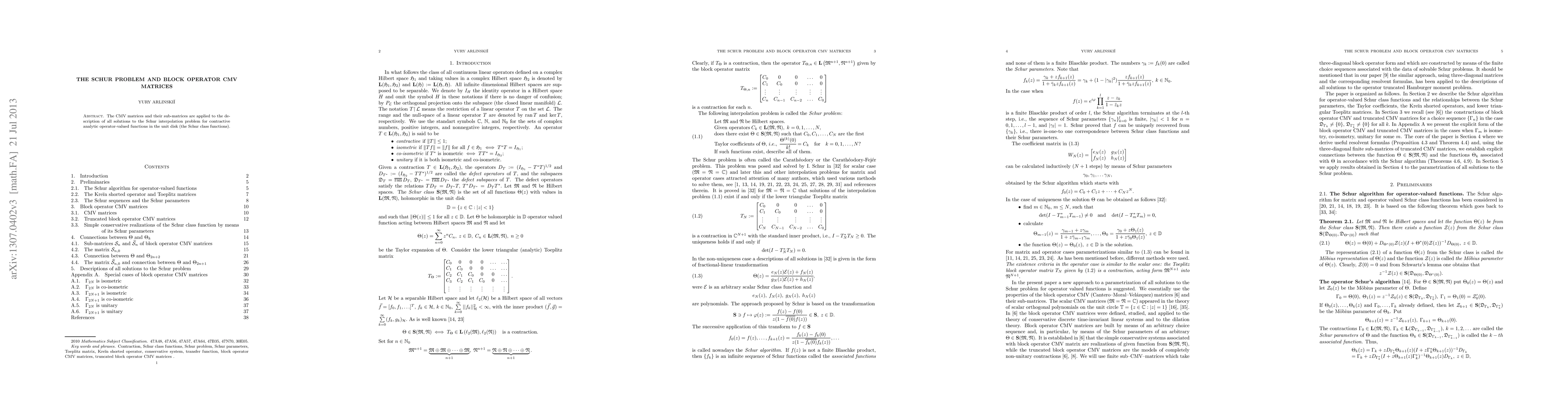 Summary: This paper explores the application of CMV matrices and their sub-matrices to describe solutions to the Schur interpolation problem for contractive analytic operator-valued functions in the unit disk, known as Schur class functions. The study highlights the role of these matrices in understanding the structure of such functions.