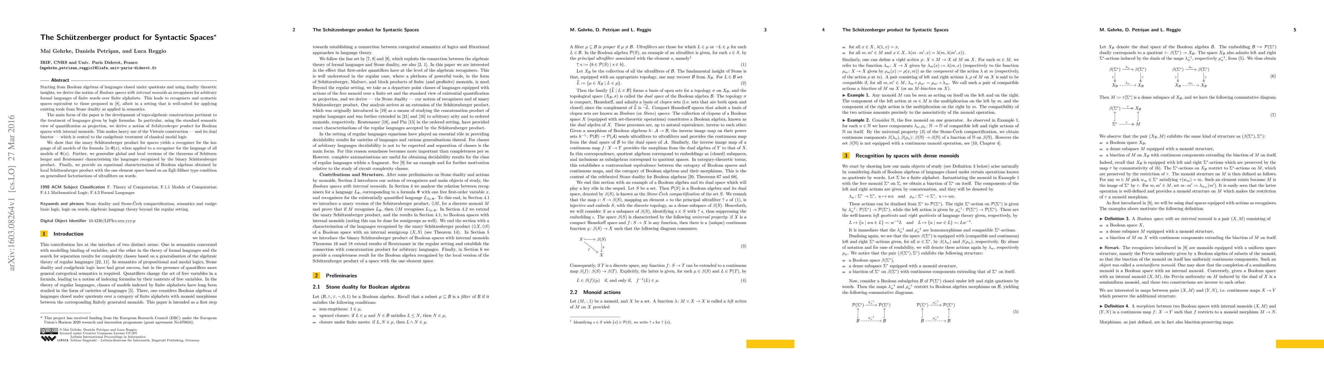 This paper develops the Sch\"utzenberger product for syntactic spaces, using Boolean spaces with internal monoids to recognize formal languages. It introduces a topo-algebraic construction for treating languages defined by logic formulas, showing how the unary Sch\"utzenberger product can yield recognisers for existentially quantified formulas.