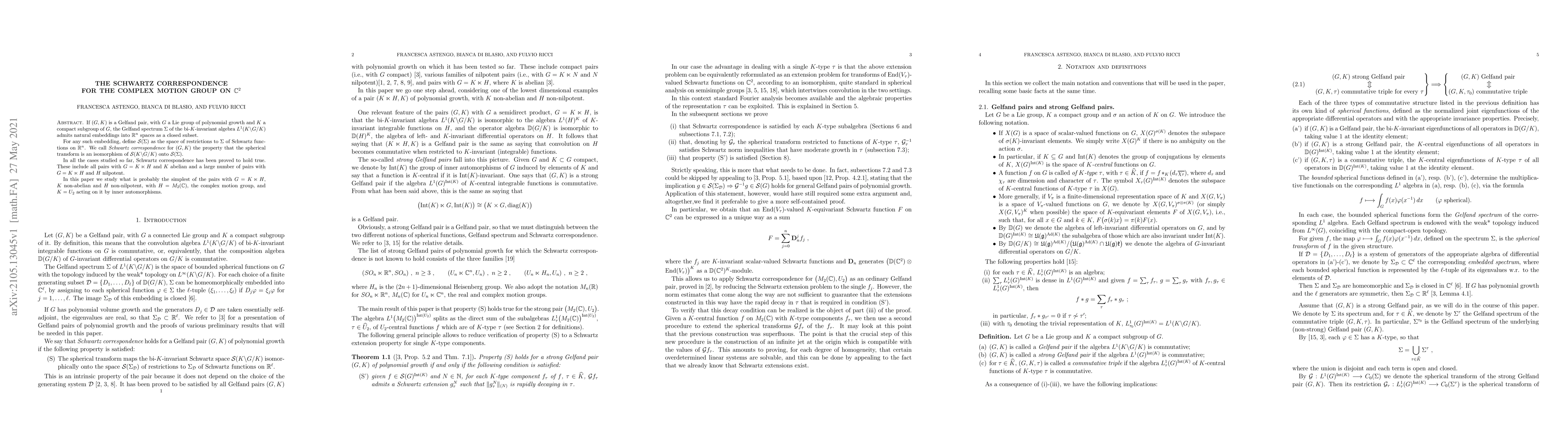 If $(G,K)$ is a Gelfand pair, with $G$ a Lie group of polynomial growth and $K$ a compact subgroup of $G$, the Gelfand spectrum $\Sigma$ of the bi-$K$-invariant algebra $L^1(K\backslash G/K)$ admits natural embeddings into ${\mathbb R}^n$ spaces as a closed subset. For any such embedding, define ${\mathcal S}(\Sigma)$ as the space of restrictions to $\Sigma$ of Schwartz functions on ${\mathbb R}^n$. We call Schwartz correspondence for $(G,K)$ the property that the spherical transform is an isomorphism of ${\mathcal S}(K\backslash G/K)$ onto ${\mathcal S}(\Sigma)$. In all the cases studied so far, Schwartz correspondence has been proved to hold true. These include all pairs with $G=K\ltimes H$ and $K$ abelian and a large number of pairs with $G=K\ltimes H$ and $H$ nilpotent. In this paper we study what is probably the simplest of the pairs with $G=K\ltimes H$, $K$ non-abelian and $H$ non-nilpotent, with $H=M_2({\mathbb C})$, the complex motion group, and $K=U_2$ acting on it by inner automorphisms.