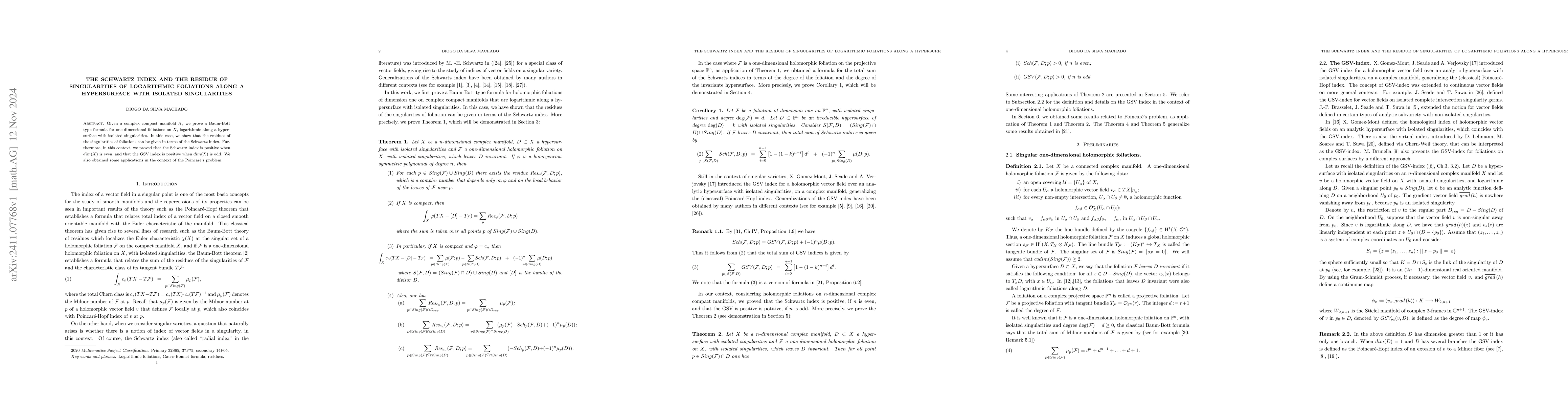 The paper proves a Baum-Bott type formula for one-dimensional foliations on a complex compact manifold, demonstrating that the residues of singularities relate to the Schwartz index. It establishes that the Schwartz index is positive for even dimensions and the GSV index for odd dimensions, with applications to Poincaré's problem.