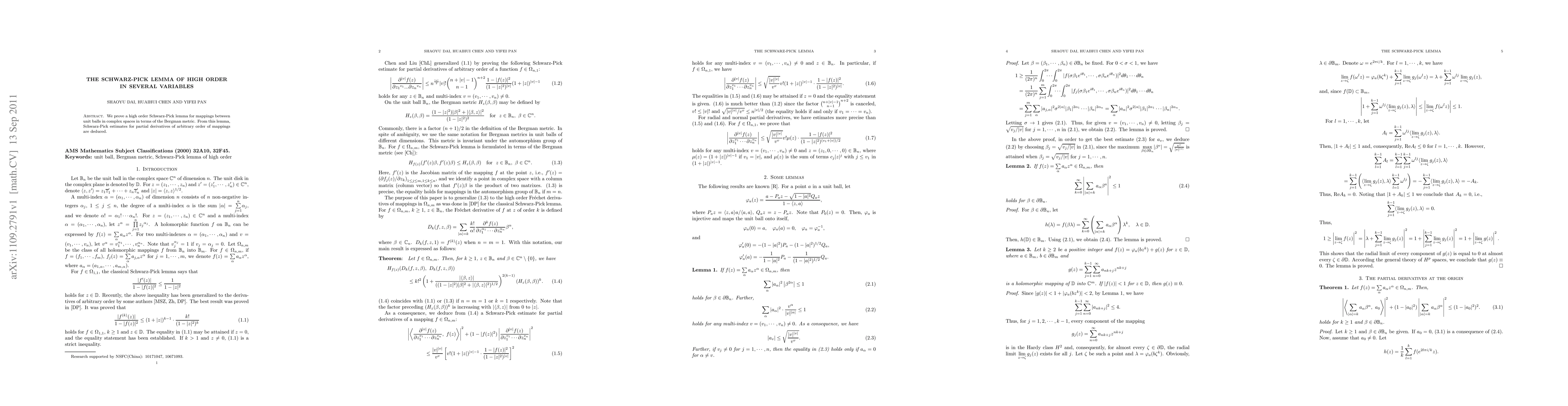 The paper proves a high-order Schwarz-Pick lemma for mappings between unit balls in complex spaces using the Bergman metric, leading to estimates for partial derivatives of arbitrary order. This extends classical results to higher-order derivatives.