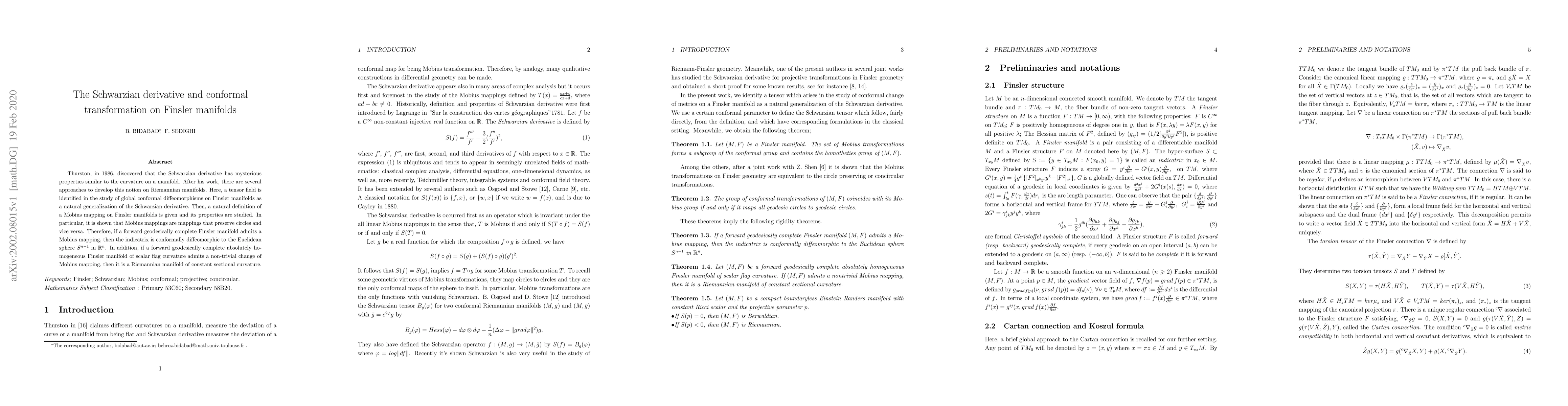 This paper generalizes the Schwarzian derivative to Finsler manifolds, identifying a tensor field for conformal transformations and defining Mobius mappings. It demonstrates that Mobius mappings on forward geodesically complete Finsler manifolds preserve circles, leading to the conclusion that such manifolds are conformally diffeomorphic to Euclidean spheres if they admit Mobius mappings.