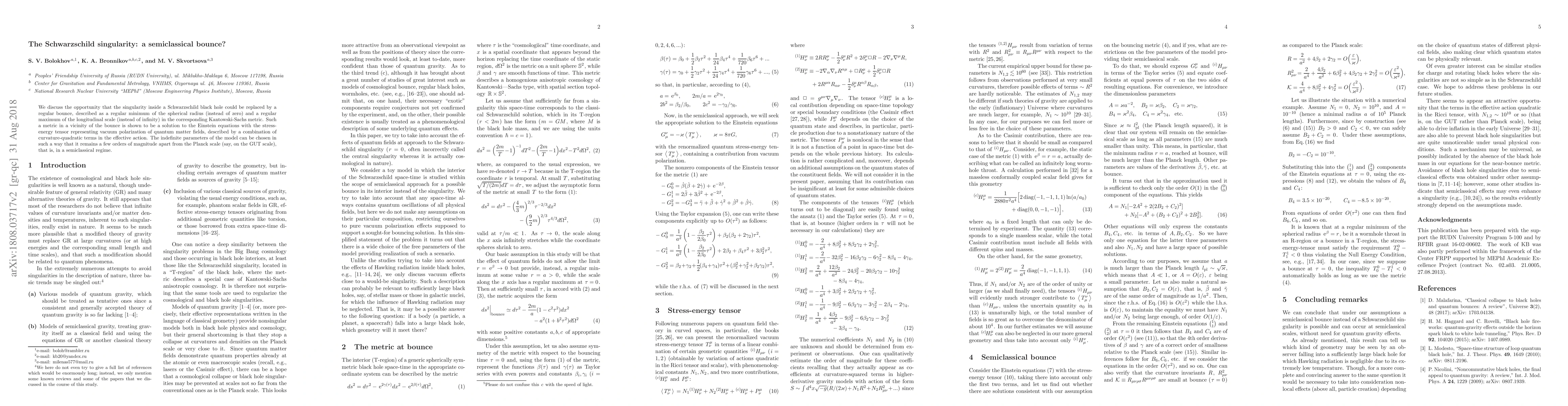 We discuss the opportunity that the singularity inside a Schwarzschild black hole could be replaced by a regular bounce, described as a regular minimum of the spherical radius (instead of zero) and a regular maximum of the longitudinal scale (instead of infinity) in the corresponding Kantowski-Sachs metric. Such a metric in a vicinity of the bounce is shown to be a solution to the Einstein equations with the stress-energy tensor representing vacuum polarization of quantum matter fields, described by a combination of curvature-quadratic terms in the effective action. The indefinite parameters of the model can be chosen in such a way that it remains a few orders of magnitude apart from the Planck scale (say, on the GUT scale), that is, in a semiclassical regime.