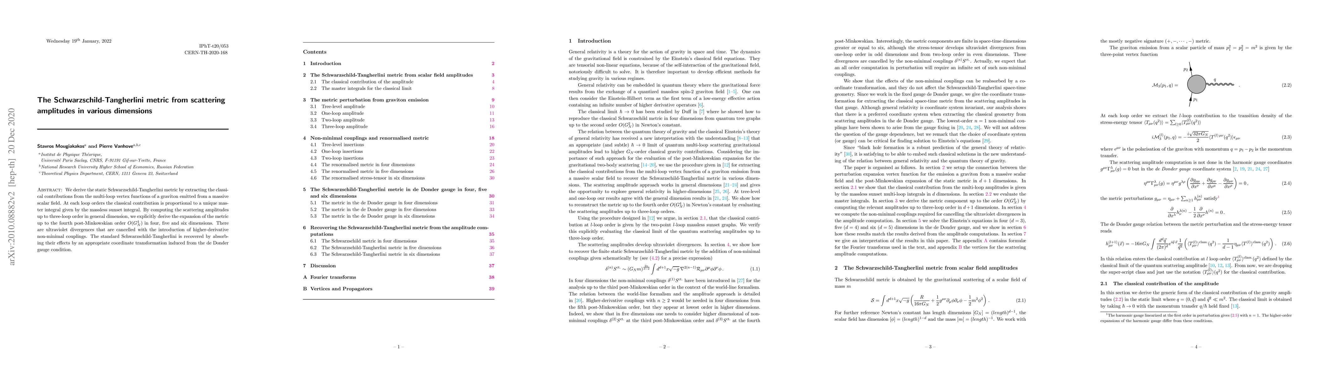 Researchers derived the Schwarzschild-Tangherlini metric from scattering amplitudes in various dimensions, recovering the standard metric with higher-derivative non-minimal couplings.