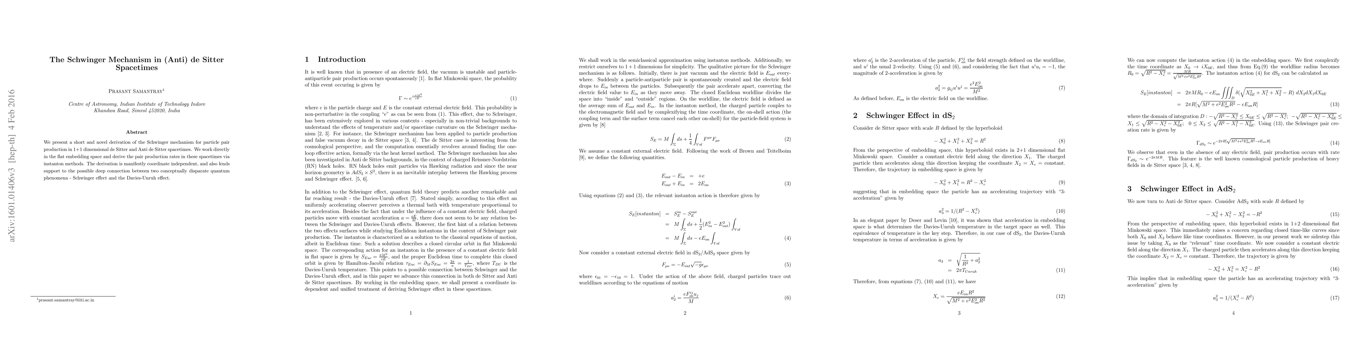 The paper provides a novel coordinate-independent derivation of the Schwinger mechanism for particle pair production in $1+1$ dimensional de Sitter and Anti de Sitter spacetimes, using instanton methods in flat embedding space, and suggests a potential connection between the Schwinger effect and the Davies-Unruh effect.