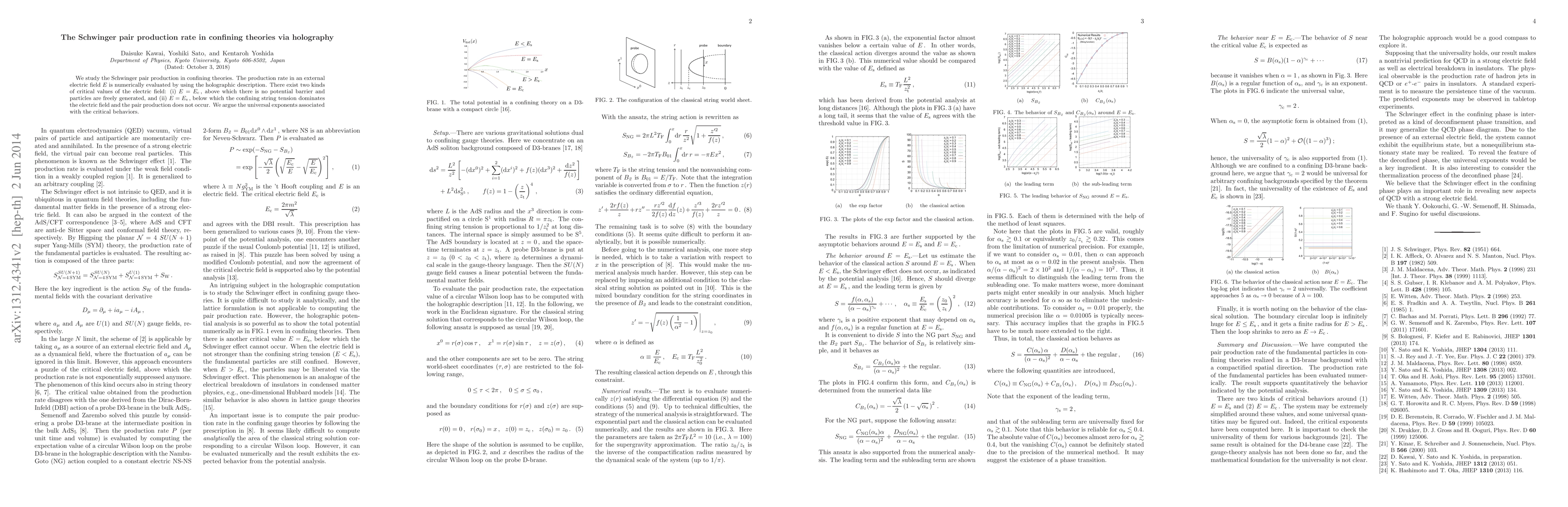 We study the Schwinger pair production in confining theories. The production rate in an external electric field E is numerically evaluated by using the holographic description. There exist two kinds of critical values of the electric field, i) E=E_c, above which there is no potential barrier and particles are freely generated, ii) E=E_s, below which the confining string tension dominates the electric field and the pair production does not occur. We argue the universal exponents associated with the critical behaviors.