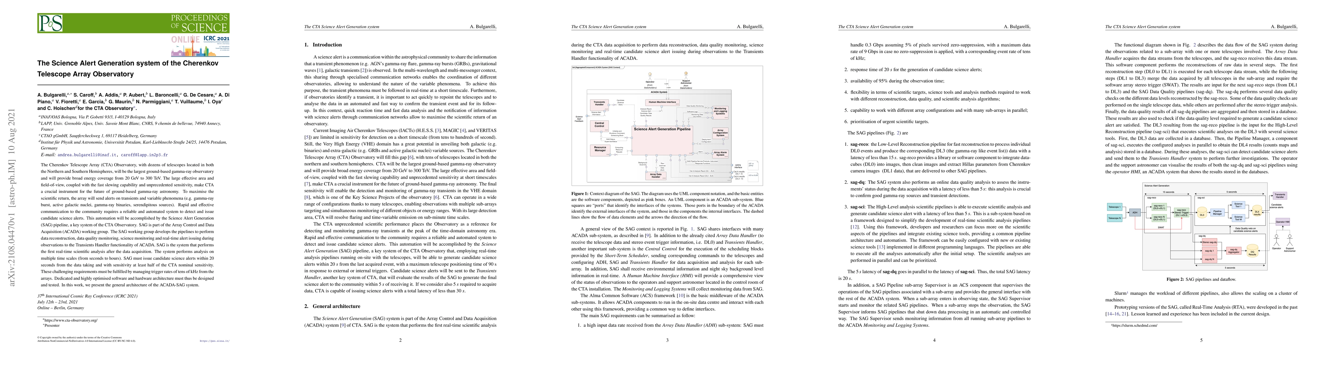 The Cherenkov Telescope Array (CTA) Observatory will utilize the Science Alert Generation (SAG) pipeline to rapidly detect and issue alerts for transient gamma-ray phenomena, ensuring timely communication to the scientific community. SAG must achieve high sensitivity and issue alerts within 20 seconds, necessitating optimized software and hardware solutions.