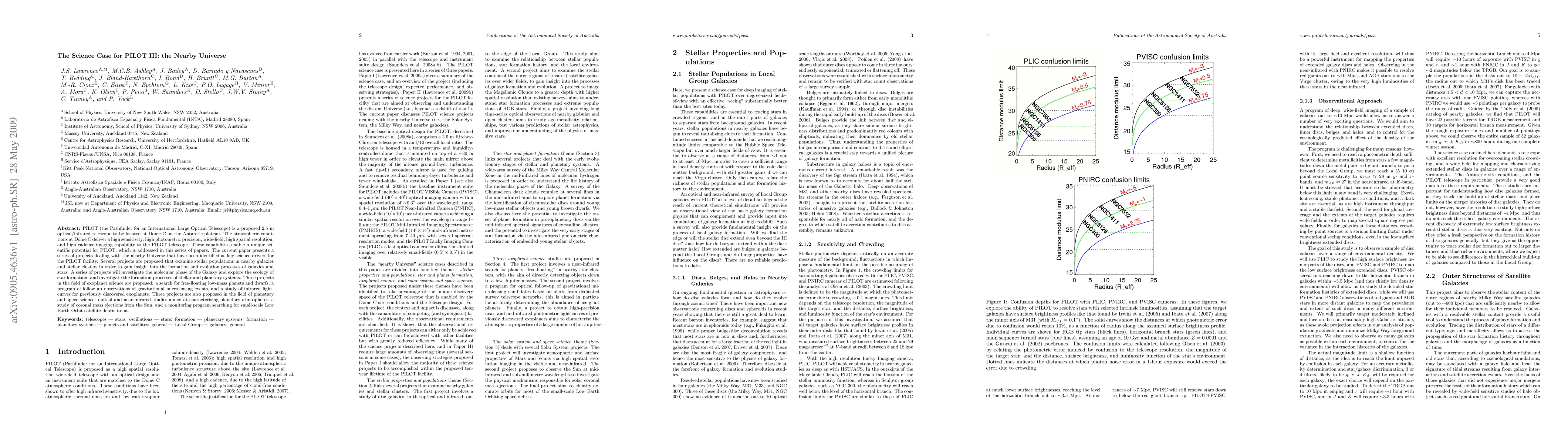PILOT (the Pathfinder for an International Large Optical Telescope is a proposed 2.5 m optical/infrared telescope to be located at DomeC on the Antarctic plateau. The atmospheric conditions at Dome C deliver a high sensitivity, high photometric precision, wide-field, high spatial resolution, and high-cadence imaging capability to the PILOT telescope. These capabilities enable a unique scientific potential for PILOT, which is addressed in this series of papers. The current paper presents a series of projects dealing with the nearby Universe that have been identified as key science drivers for the PILOT facility. Several projects are proposed that examine stellar populations in nearby galaxies and stellar clusters in order to gain insight into the formation and evolution processes of galaxies and stars. A series of projects will investigate the molecular phase of the Galaxy and explore the ecology of star formation, and investigate the formation processes of stellar and planetary systems. Three projects in the field of exoplanet science are proposed: a search for free-floating low-mass planets and dwarfs, a program of follow-up observations of gravitational microlensing events, and a study of infrared light-curves for previously discovered exoplanets. Three projects are also proposed in the field of planetary and space science: optical and near-infrared studies aimed at characterising planetary atmospheres, a study of coronal mass ejections from the Sun, and a monitoring program searching for small-scale Low Earth Orbit satellite debris items.