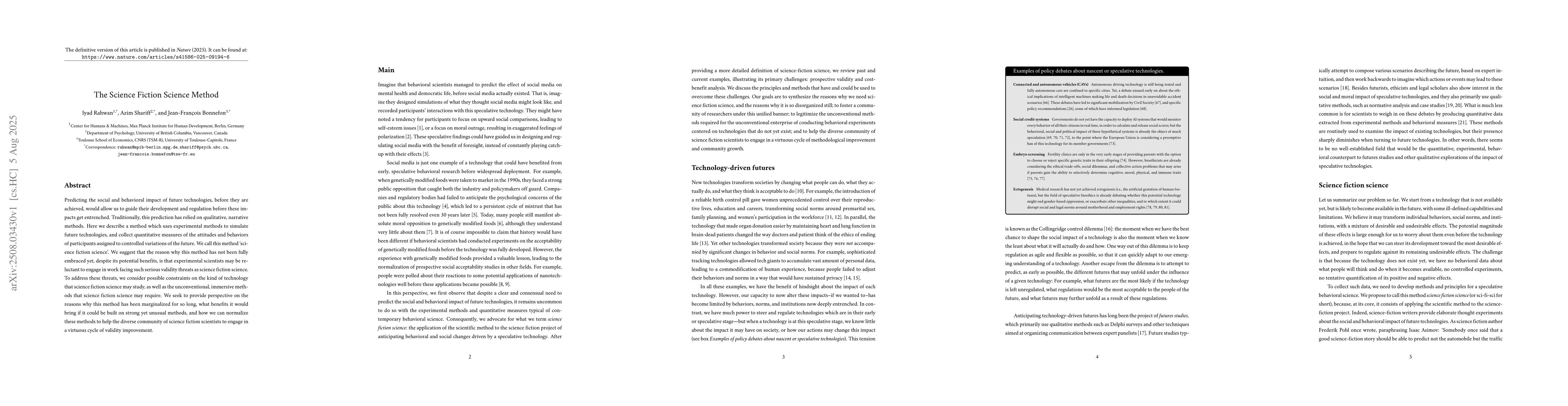 Predicting the social and behavioral impact of future technologies, before they are achieved, would allow us to guide their development and regulation before these impacts get entrenched. Traditionally, this prediction has relied on qualitative, narrative methods. Here we describe a method which uses experimental methods to simulate future technologies, and collect quantitative measures of the attitudes and behaviors of participants assigned to controlled variations of the future. We call this method 'science fiction science'. We suggest that the reason why this method has not been fully embraced yet, despite its potential benefits, is that experimental scientists may be reluctant to engage in work facing such serious validity threats as science fiction science. To address these threats, we consider possible constraints on the kind of technology that science fiction science may study, as well as the unconventional, immersive methods that science fiction science may require. We seek to provide perspective on the reasons why this method has been marginalized for so long, what benefits it would bring if it could be built on strong yet unusual methods, and how we can normalize these methods to help the diverse community of science fiction scientists to engage in a virtuous cycle of validity improvement.