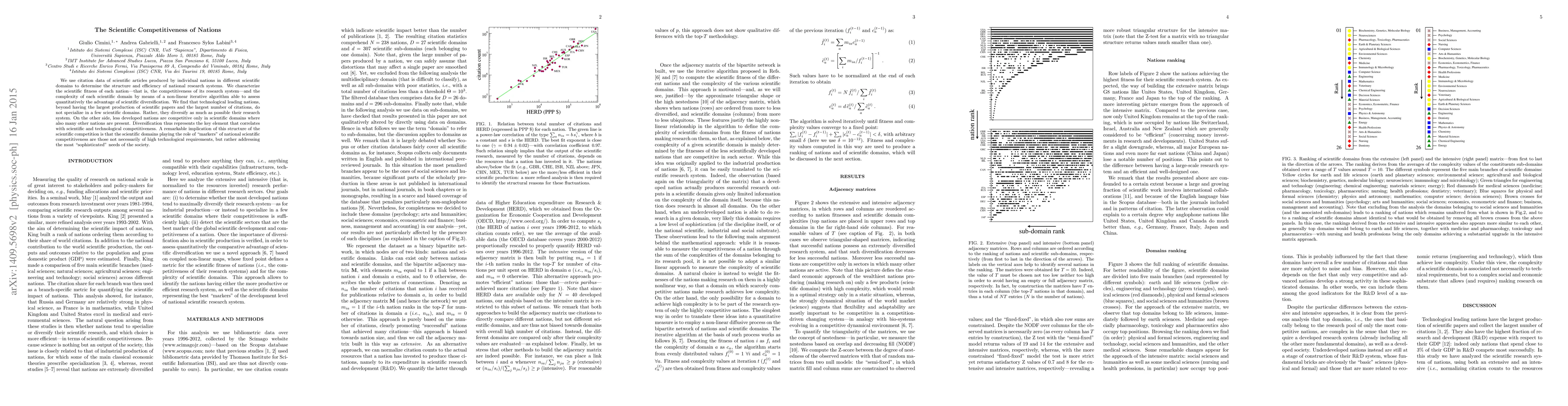 We use citation data of scientific articles produced by individual nations in different scientific domains to determine the structure and efficiency of national research systems. We characterize the scientific fitness of each nation (that is, the competitiveness of its research system) and the complexity of each scientific domain by means of a non-linear iterative algorithm able to assess quantitatively the advantage of scientific diversification. We find that technological leading nations, beyond having the largest production of scientific papers and the largest number of citations, do not specialize in a few scientific domains. Rather, they diversify as much as possible their research system. On the other side, less developed nations are competitive only in scientific domains where also many other nations are present. Diversification thus represents the key element that correlates with scientific and technological competitiveness. A remarkable implication of this structure of the scientific competition is that the scientific domains playing the role of "markers" of national scientific competitiveness are those not necessarily of high technological requirements, but rather addressing the most "sophisticated" needs of the society.