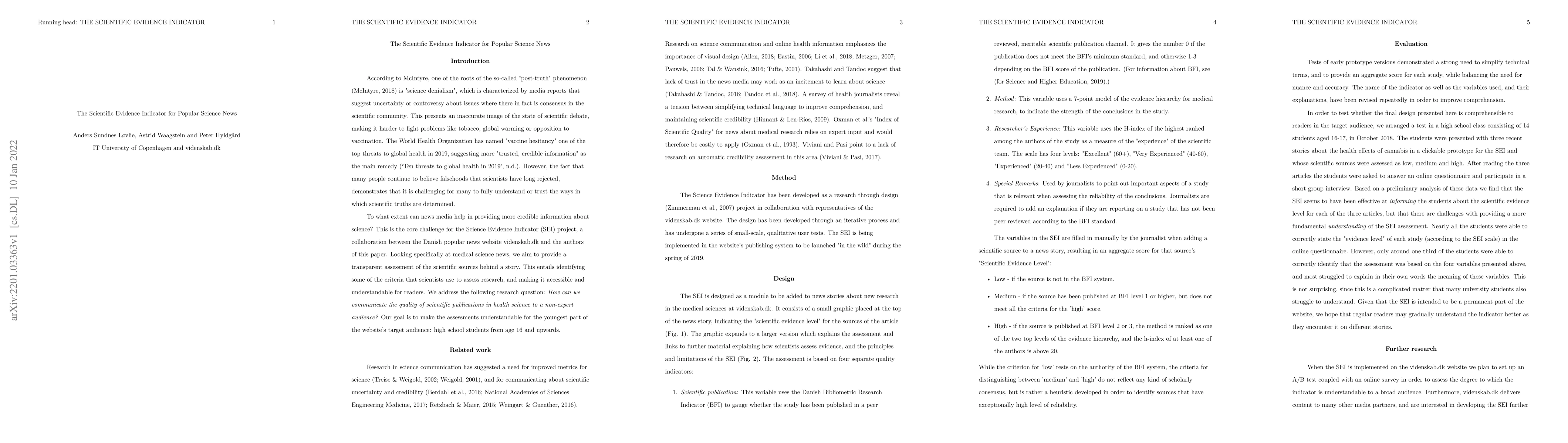 To what extent can news media help in providing more credible information about science? This is the core challenge for the Science Evidence Indicator (SEI) project, a collaboration between the Danish popular news website videnskab.dk and the authors of this paper. Looking specifically at medical science news, we aim to provide a transparent assessment of the scientific sources behind a story. This entails identifying some of the criteria that scientists use to assess research, and making it accessible and understandable for readers. We address the following research question: How can we communicate the quality of scientific publications in health science to a non-expert audience? Our goal is to make the assessments understandable for the youngest part of the website's target audience: high school students from age 16 and upwards.