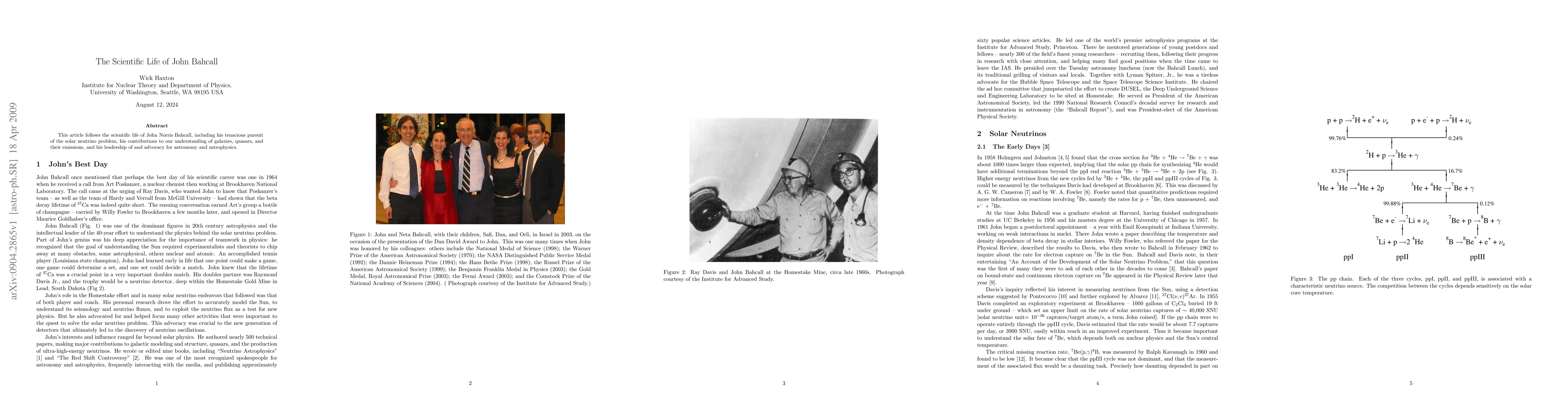 This article follows the scientific life of John Norris Bahcall, including his tenacious pursuit of the solar neutrino problem, his contributions to our understanding of galaxies, quasars, and their emissions, and his leadership of and advocacy for astronomy and astrophysics.