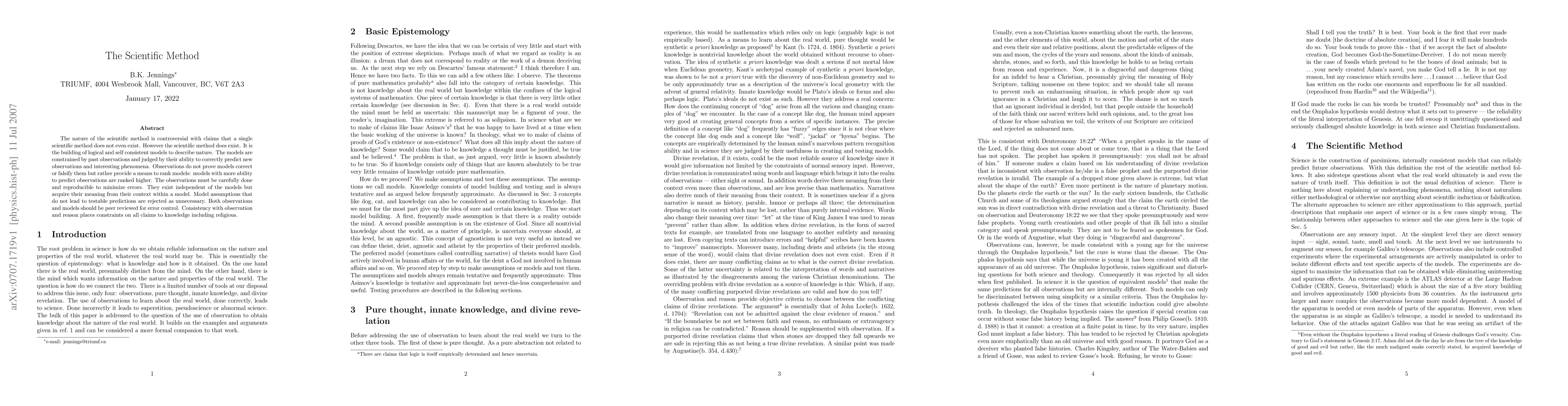 The nature of the scientific method is controversial with claims that a single scientific method does not even exist. However the scientific method does exist. It is the building of logical and self consistent models to describe nature. The models are constrained by past observations and judged by their ability to correctly predict new observations and interesting phenomena. The observations exist independent of the models but acquire meaning from their context within a model. Observations must be carefully done and reproducible to minimize errors. Models assumptions that do not lead to testable predictions are rejected as unnecessary.