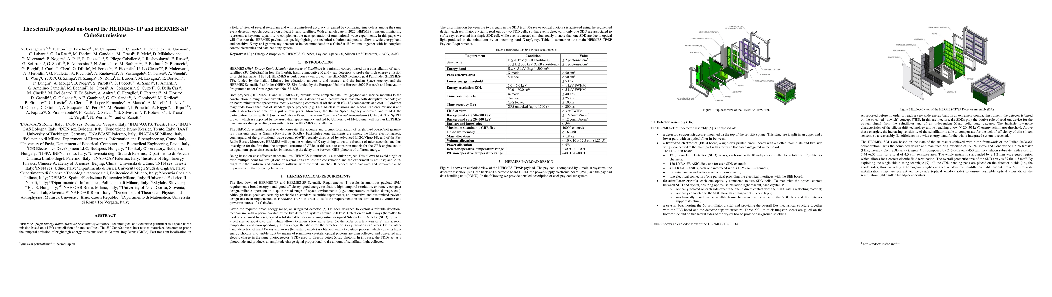This paper details the scientific payload of the HERMES CubeSat missions, designed to detect and localize high-energy transients like Gamma-Ray Bursts using miniaturized detectors on a LEO nano-satellite constellation. The payload includes innovative technical solutions to fit a wide-energy-band X-ray and gamma-ray detector within a 1U CubeSat volume.