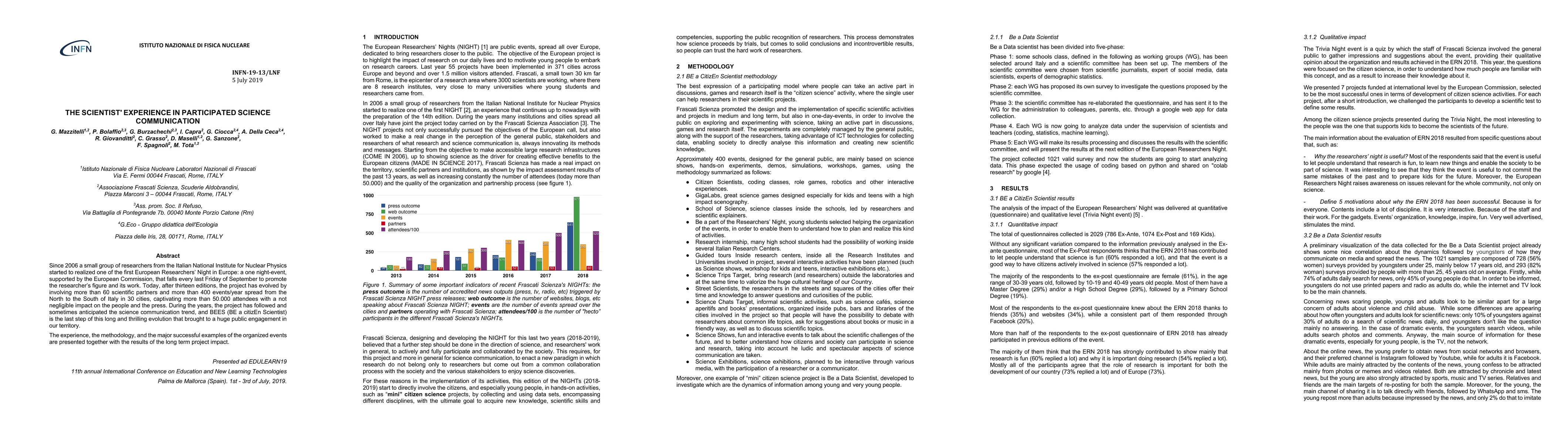The paper details a 13-year Italian project, starting in 2006, that has grown from a single event to a nationwide initiative involving over 60 partners and 400 annual events. The project, called 'Researchers' Night', has significantly engaged the public, attracting over 50,000 attendees and influencing science communication trends, culminating in the 'BE a citizen Scientist' initiative.