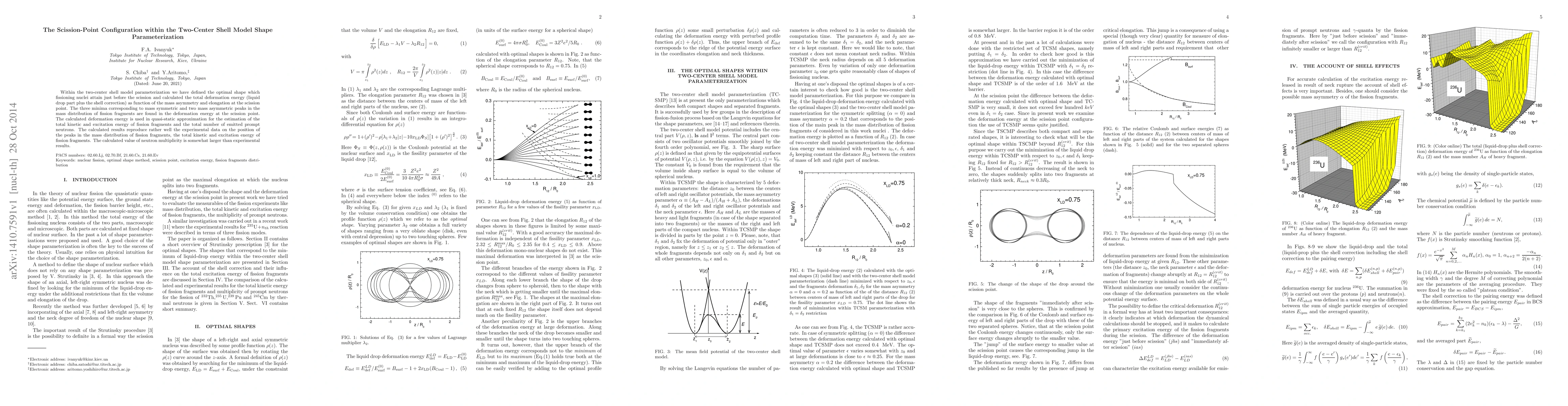 This paper defines the optimal scission-point configuration in the two-center shell model and calculates the total deformation energy, showing three minima corresponding to symmetric and asymmetric fission peaks. The model estimates fission fragment energies and neutron emission, reproducing experimental data well except for neutron multiplicity.
