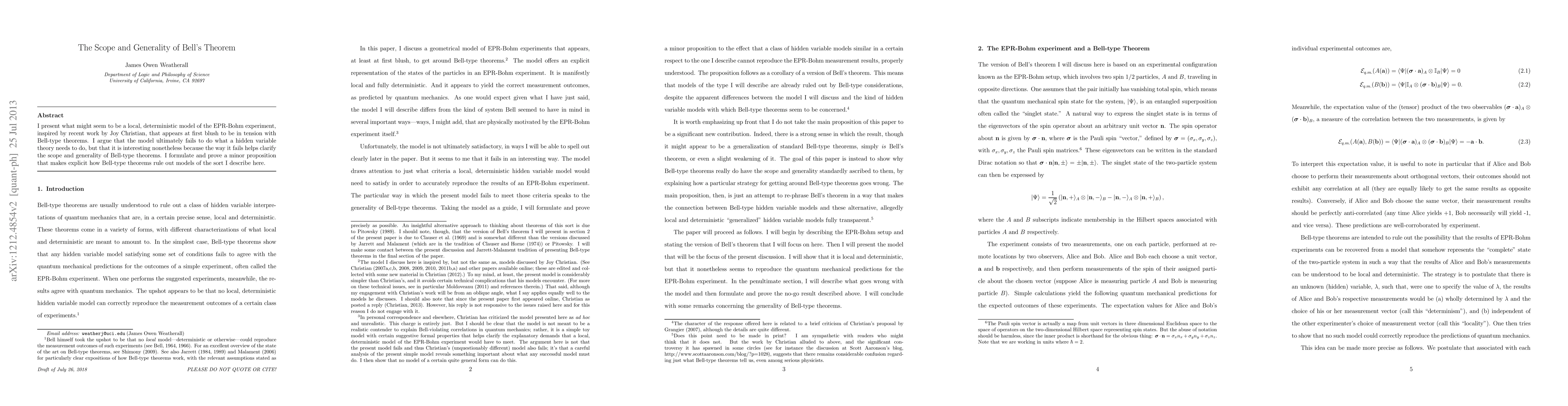 I present what might seem to be a local, deterministic model of the EPR-Bohm experiment, inspired by recent work by Joy Christian, that appears at first blush to be in tension with Bell-type theorems. I argue that the model ultimately fails to do what a hidden variable theory needs to do, but that it is interesting nonetheless because the way it fails helps clarify the scope and generality of Bell-type theorems. I formulate and prove a minor proposition that makes explicit how Bell-type theorems rule out models of the sort I describe here.
