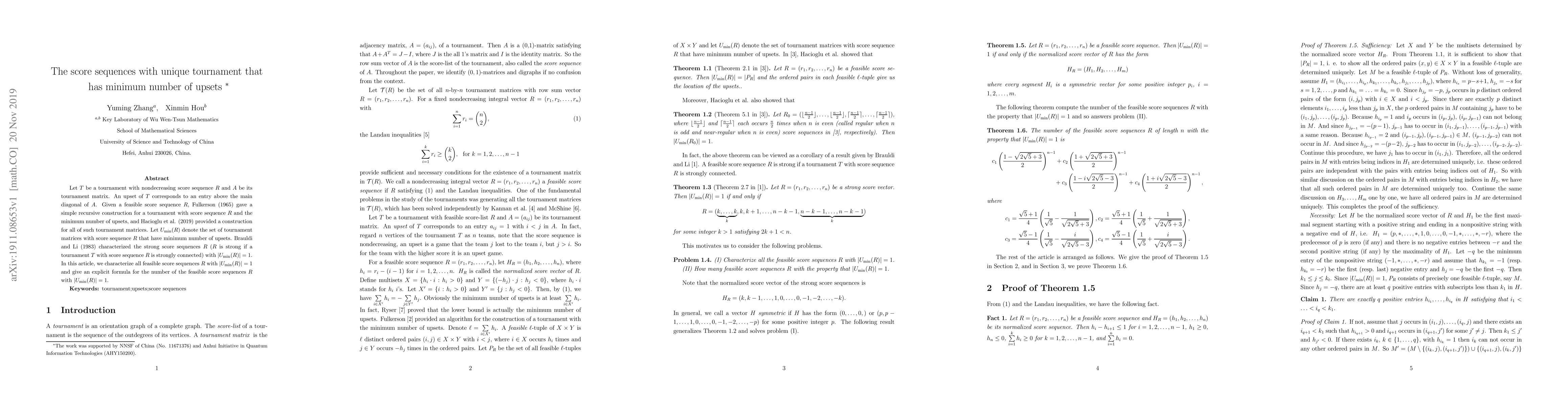 Let $T$ be a tournament with nondecreasing score sequence $R$ and $A$ be its tournament matrix. An upset of $T$ corresponds to an entry above the main diagonal of $A$. Given a feasible score sequence $R$, Fulkerson~(1965) gave a simple recursive construction for a tournament with score sequence $R$ and the minimum number of upsets, and Hacioglu et al. (2019) provided a construction for all of such tournament matrices. Let $U_{\min}(R)$ denote the set of tournament matrices with score sequence $R$ that have minimum number of upsets. Brauldi and Li~(1983) characterized the strong score sequences $R$ ($R$ is strong if a tournament $T$ with score sequence $R$ is strongly connected) with $|U_{\min}(R)|=1$. In this article, we characterize all feasible score sequences $R$ with $|U_{\min}(R)|=1$ and give an explicit formula for the number of the feasible score sequences $R$ with $|U_{\min}(R)|=1$.