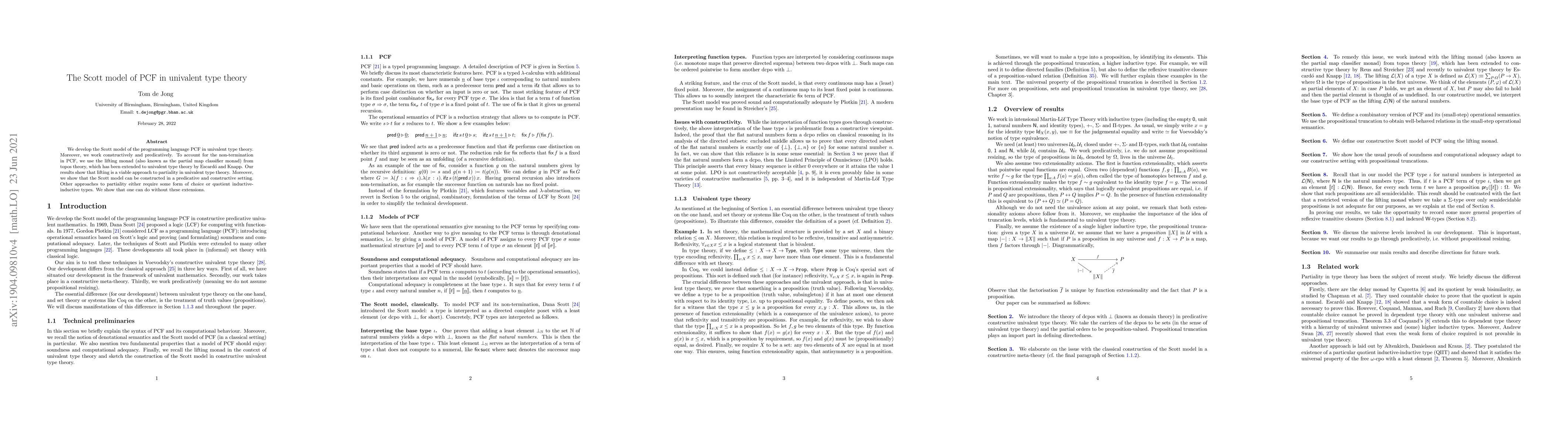 We develop the Scott model of the programming language PCF in univalent type theory. Moreover, we work constructively and predicatively. To account for the non-termination in PCF, we use the lifting monad (also known as the partial map classifier monad) from topos theory, which has been extended to univalent type theory by Escard\'o and Knapp. Our results show that lifting is a viable approach to partiality in univalent type theory. Moreover, we show that the Scott model can be constructed in a predicative and constructive setting. Other approaches to partiality either require some form of choice or quotient inductive-inductive types. We show that one can do without these extensions.