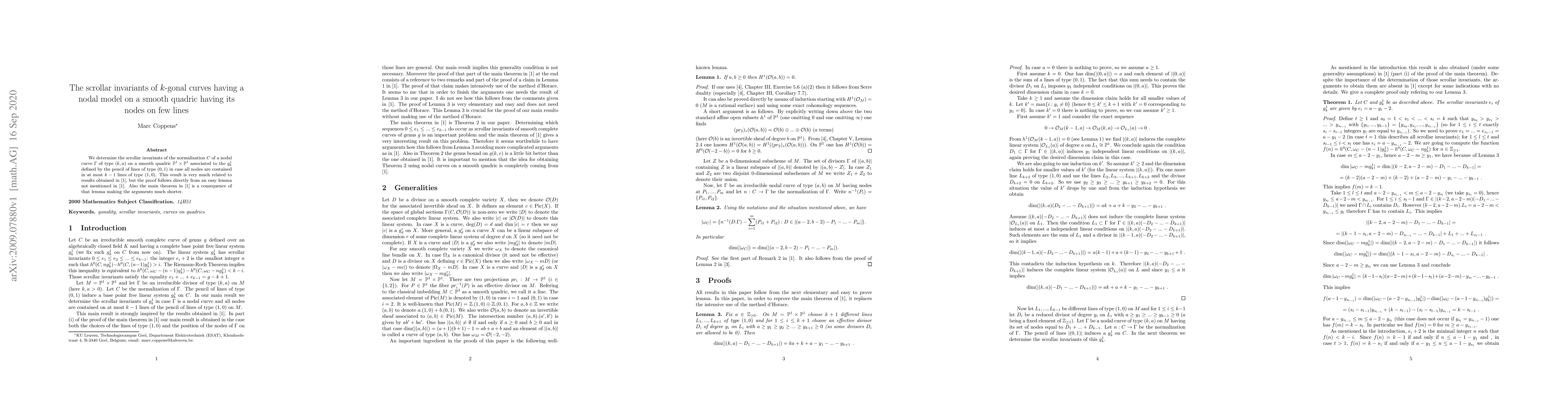 This paper determines the scrollar invariants of a nodal curve on a smooth quadric, showing that if all nodes lie on at most $k-1$ lines, the result follows directly from a simple lemma. This approach also confirms a related result by E. Ballico on the existence of curves with specific scrollar invariants.