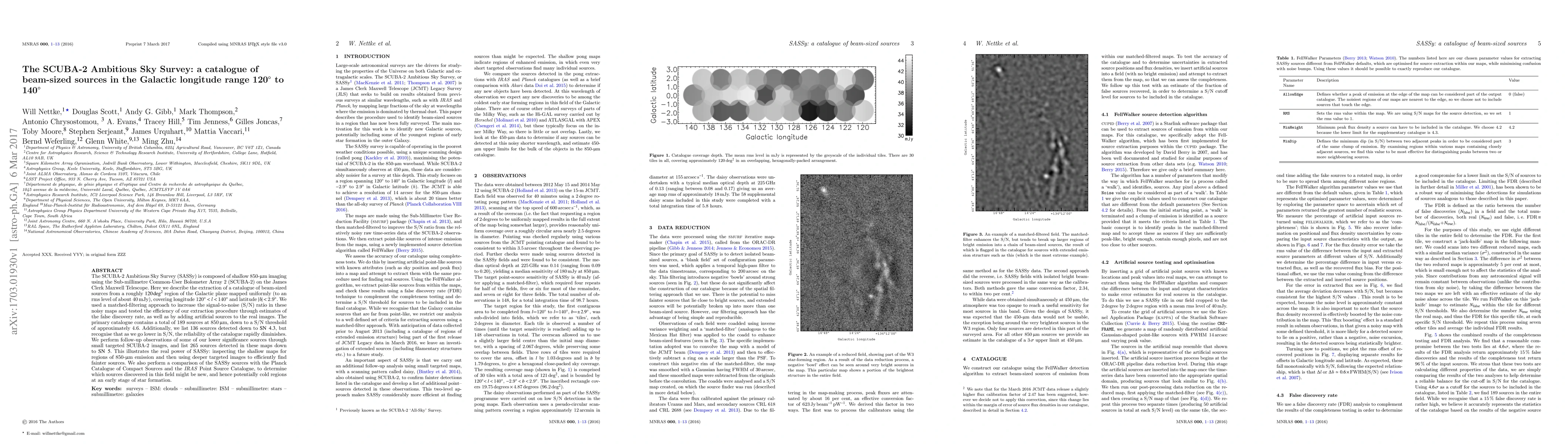 The SCUBA-2 Ambitious Sky Survey (SASSy) is composed of shallow 850-$\umu$m imaging using the Sub-millimetre Common-User Bolometer Array 2 (SCUBA-2) on the James Clerk Maxwell Telescope. Here we describe the extraction of a catalogue of beam-sized sources from a roughly $120\,{\rm deg}^2$ region of the Galactic plane mapped uniformly (to an rms level of about 40\,mJy), covering longitude 120\degr\,$<$\,\textit{l}\,$<$\,140\degr\ and latitude $\abs{\textit{b}}$\,$<$\,2.9\degr. We used a matched-filtering approach to increase the signal-to-noise (S/N) ratio in these noisy maps and tested the efficiency of our extraction procedure through estimates of the false discovery rate, as well as by adding artificial sources to the real images. The primary catalogue contains a total of 189 sources at 850\,$\umu$m, down to a S/N threshold of approximately 4.6. Additionally, we list 136 sources detected down to ${\rm S/N}=4.3$, but recognise that as we go lower in S/N, the reliability of the catalogue rapidly diminishes. We perform follow-up observations of some of our lower significance sources through small targeted SCUBA-2 images, and list 265 sources detected in these maps down to ${\rm S/N}=5$. This illustrates the real power of SASSy: inspecting the shallow maps for regions of 850-$\umu$m emission and then using deeper targeted images to efficiently find fainter sources. We also perform a comparison of the SASSy sources with the Planck Catalogue of Compact Sources and the \textit{IRAS} Point Source Catalogue, to determine which sources discovered in this field might be new, and hence potentially cold regions at an early stage of star formation.