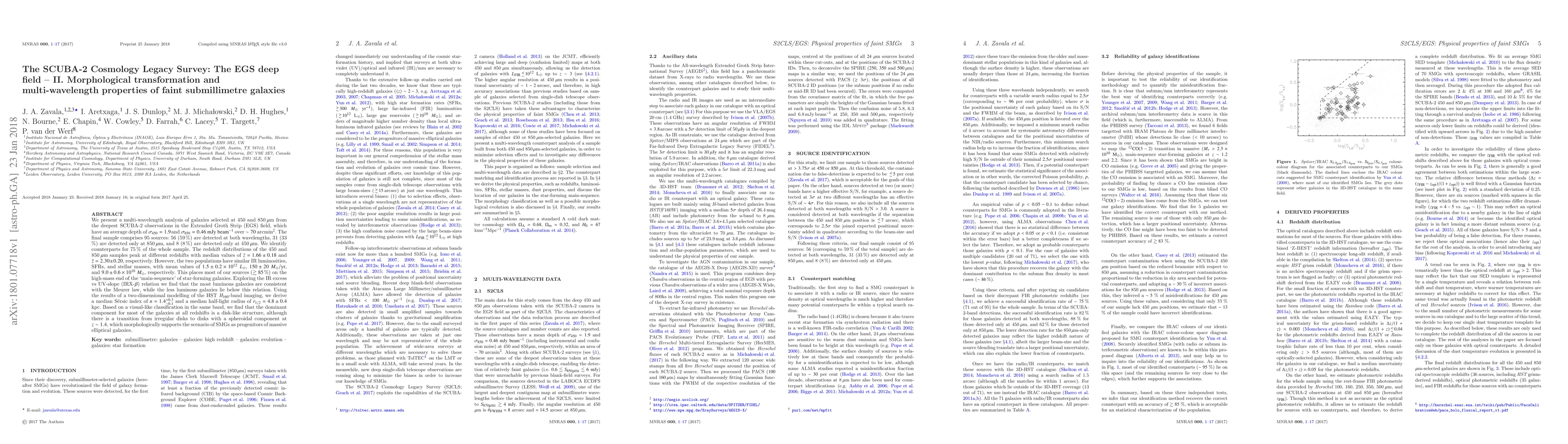 The study analyzes 95 submillimetre galaxies in the EGS deep field using SCUBA-2 data, identifying their redshifts, luminosities, star formation rates, and stellar masses. Most are on the high-mass end of star-forming galaxies' main sequence. Morphological analysis reveals a transition from irregular to disk-like structures with a spheroidal component around z~1.4, suggesting SMGs as progenitors of massive elliptical galaxies.