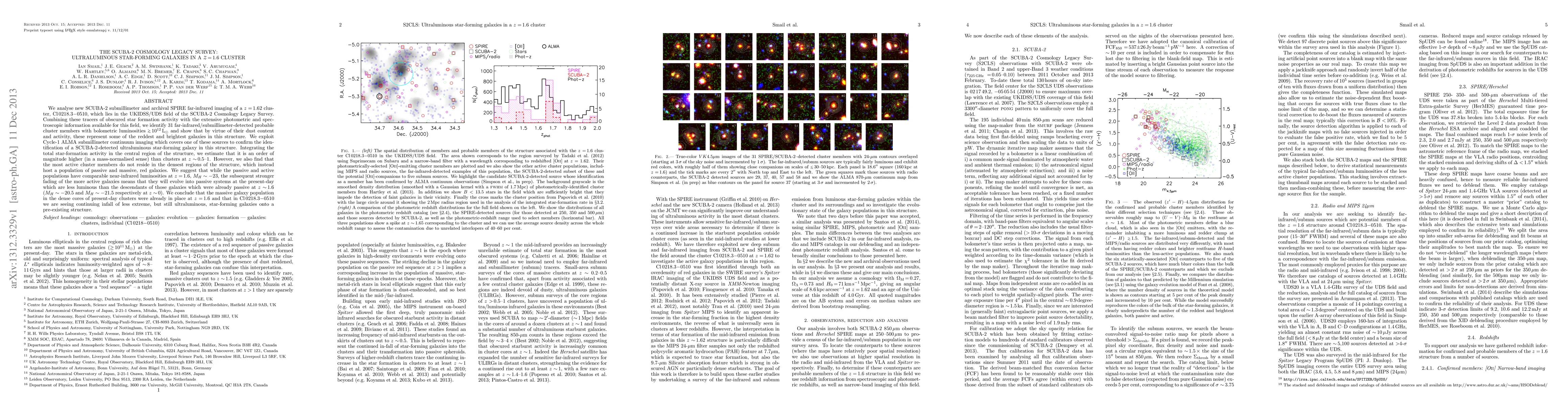 This study identifies ultraluminous star-forming galaxies in a z=1.62 cluster using SCUBA-2 and SPIRE imaging, revealing significantly higher star-formation activity compared to lower-redshift clusters. Despite intense star formation, the most active galaxies do not occupy the densest regions, which host passive, massive galaxies.
