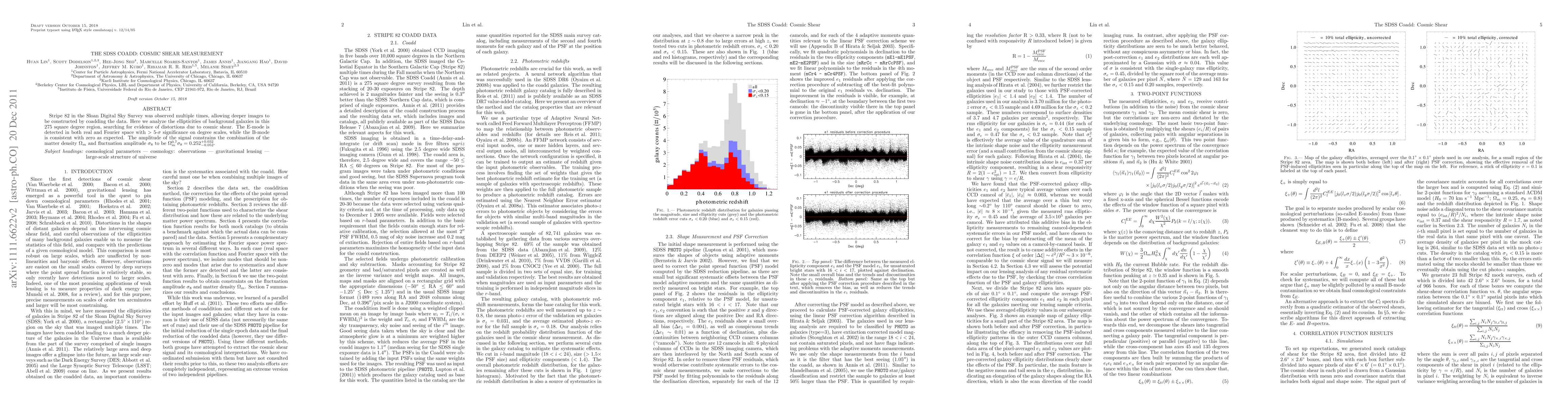 Stripe 82 in the Sloan Digital Sky Survey was observed multiple times, allowing deeper images to be constructed by coadding the data. Here we analyze the ellipticities of background galaxies in this 275 square degree region, searching for evidence of distortions due to cosmic shear. The E-mode is detected in both real and Fourier space with $>5$-$\sigma$ significance on degree scales, while the B-mode is consistent with zero as expected. The amplitude of the signal constrains the combination of the matter density $\Omega_m$ and fluctuation amplitude $\sigma_8$ to be $\Omega_m^{0.7}\sigma_8 = 0.252^{+0.032}_{-0.052}$.