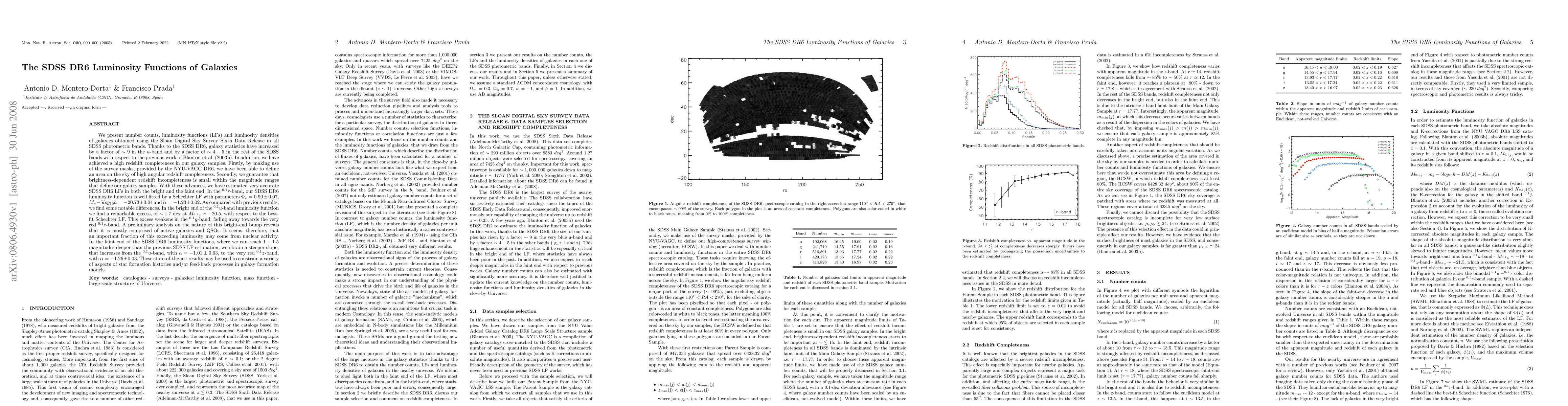 This paper presents luminosity functions and densities of galaxies from the SDSS DR6, showing significant improvements in sample size and completeness. It finds an excess in the bright end of the u-band luminosity function, attributed to active galaxies and QSOs, and a steeper slope in the faint end.