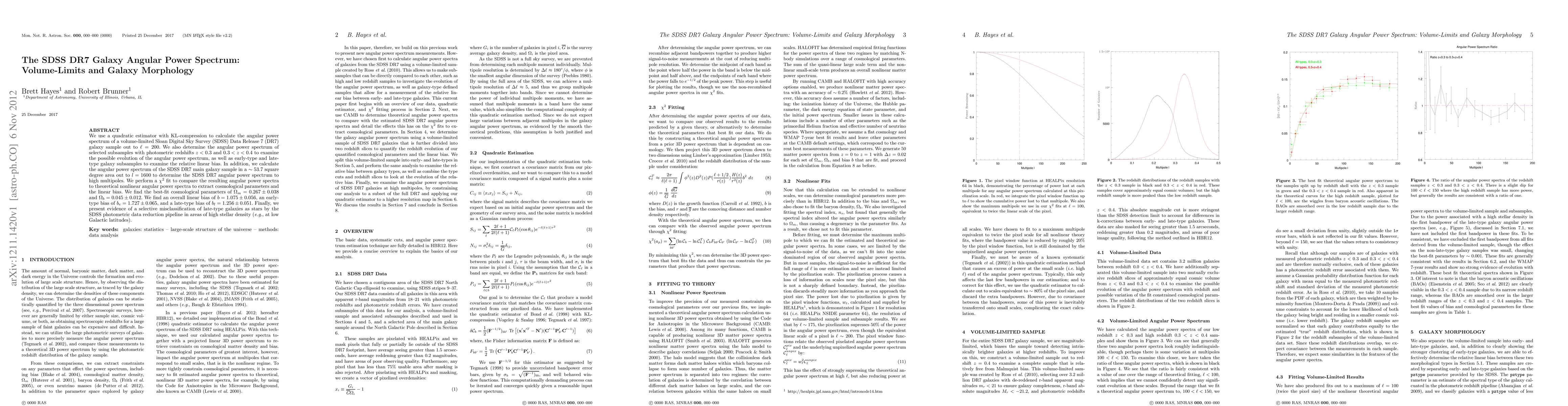 This study calculates the angular power spectrum of the SDSS DR7 galaxy sample using a quadratic estimator and KL-compression, examining subsamples by redshift and morphology to determine cosmological parameters and linear bias. The best-fit cosmological parameters are found to be \Omega_m = 0.267 +- 0.038 and \Omega_b = 0.045 +- 0.012.